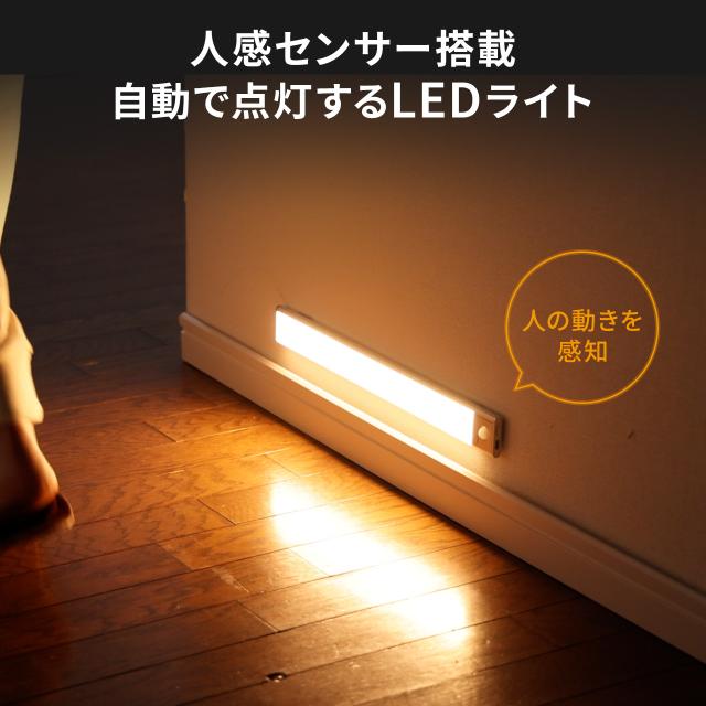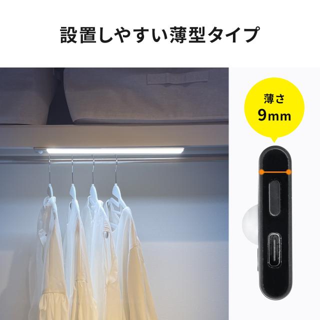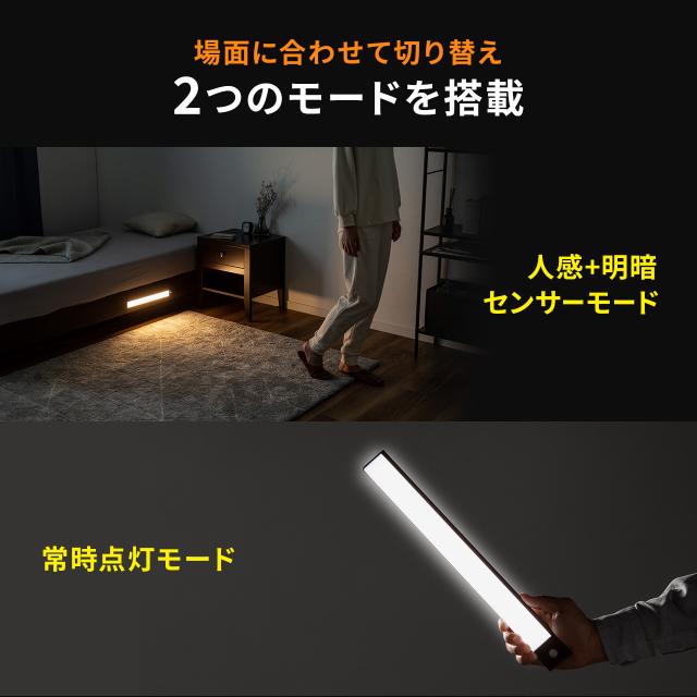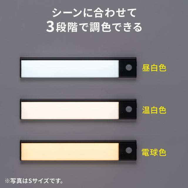 ⇒ご購入の前にご確認下さいマグネット取り付け、両面テープでの取り付けができる、人感センサー付きLEDライト。3色での色切替ができ、常時点灯も可能。約9cmの薄型筐体でUSB充電式のLEDライト。40cm。ブラック。【WEB限定商品】