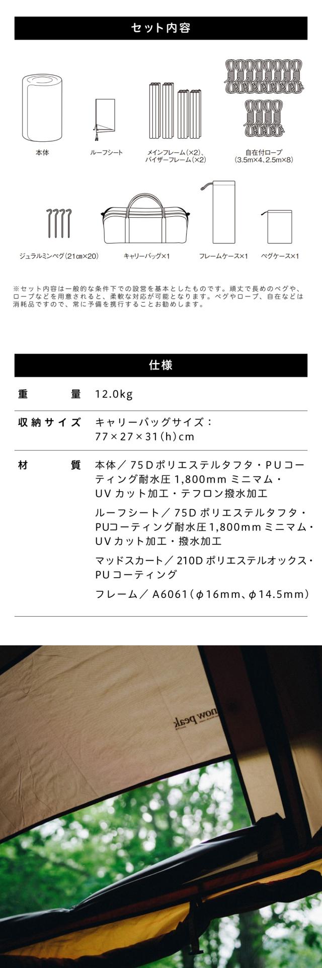 * セット内容:本体、ルーフシート、メインフレーム(×2)、バイザーフレーム(×2)、ジュラルミンペグ(21cm×20)、自在付ロープ(3.5m×4、2.5m×8)、キャリーバッグ、フレームケース、ペグケース
