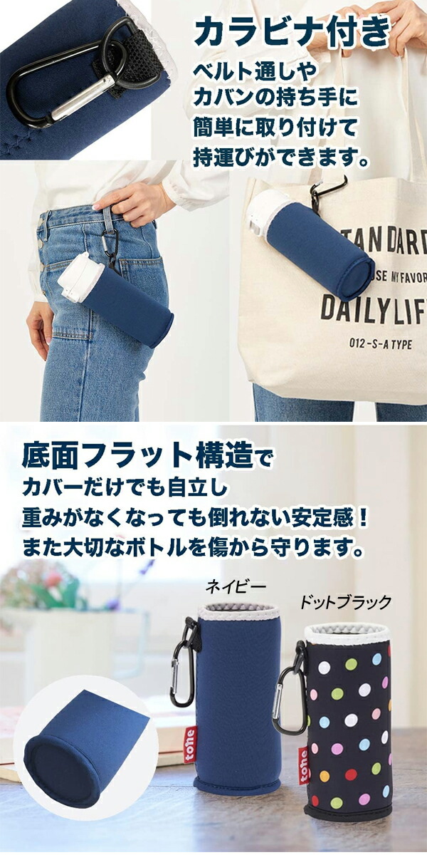 ●素材はウェットスーツなどに使われる特殊ゴムで、ボトルを傷から守ります。 ●カバーだけでも自立する底面フラット構造。本体付属のフックを使って掛けて 持ち運びできます。 |