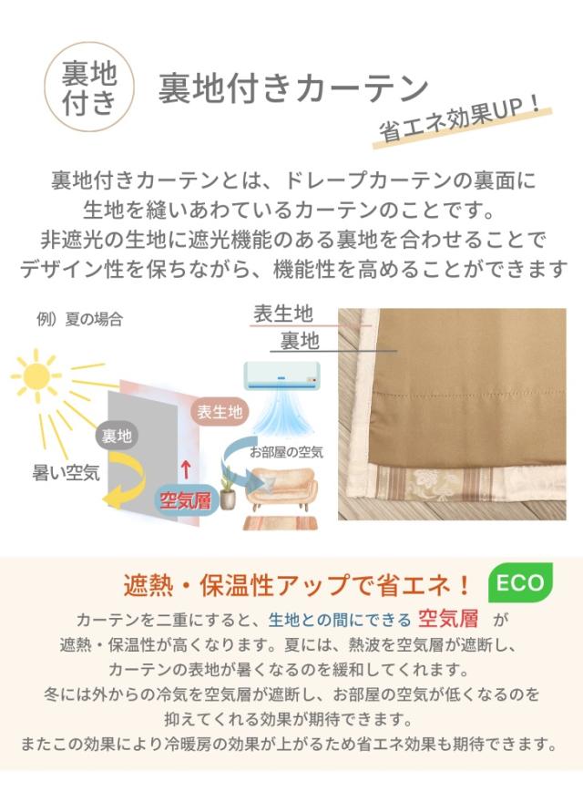 | 裏地付きカーテンは生地との間に空気層ができることで、遮熱・保温星が高くなります。 デザイン性の高い非遮光生地と裏地を合わせることで、デザイン性と機能性を高めることができます。 夏は涼しく、冬はあたたかく1年中快適に過ごせます。冷暖房の効率を上げることは省エネ効果も期待できます。 |