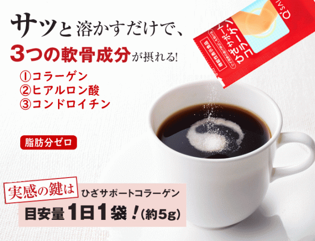 機能性関与成分「コラーゲンペプチド」に加え、「ヒアルロン酸」「コンドロイチン」といった軟骨成分も配合。脂質ゼロ。歩く・立つ・座る・伸ばす・・・ひざ関節の曲げ伸ばしを助けます。冷たいお飲み物にも温かいお飲み物にも、サッと溶けやすい独自製法で仕上げました。毎日続けやすい手軽さが魅力です。