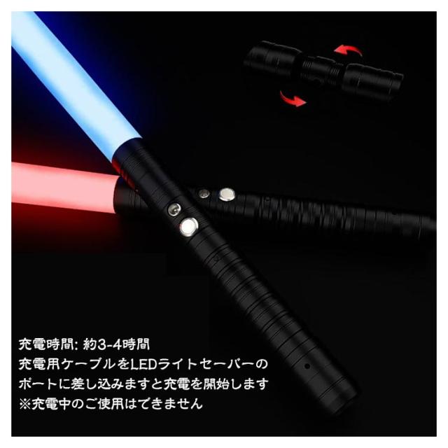 | 【充電式リチウムバッテリーを搭載】充電時間: 約3-4時間。充電用ケーブルをLEDライトセーバーのポートに差し込みますと充電を開始します。※充電中のご使用はできません。 【14色+交互のグラデーション】ボタンを押すごとに14色に光る、カラーバリエーションを楽しめます。電源ボタンを押すごとに色が切り替わり、全15種類のパターンを楽しめます。(14色+交互のグラデーション) 【3つの効果音】サウンドモード:スイッチを短押しすると、駆動音とともにセーバーが発光し、待機音が流れます。スイッチを押しすると、スイッチを押して14色の切り替えと背景音が伴います。衝撃に合わせ、衝撃音が鳴り響きます。 【ミュートモード】スイッチを3S長押しすると、駆動音とともにセーバーが発光します。スイッチを押しすると、スイッチを押して色を切り替えます。切り替えの過程に背景音はありません。 | |