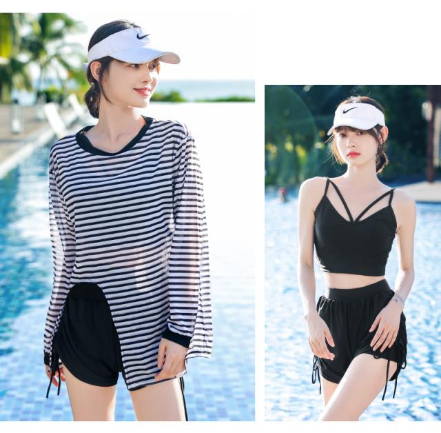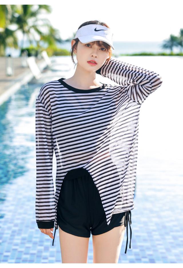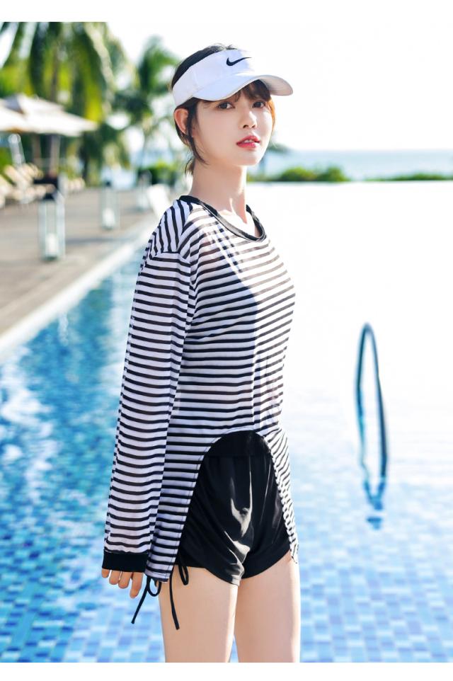 水着 レディース 体型カバー カップ付き ボーダー セパレート 3点セット 長袖 Tシャツ タンキニ ショートパンツ ママ水着 無地 uvカット