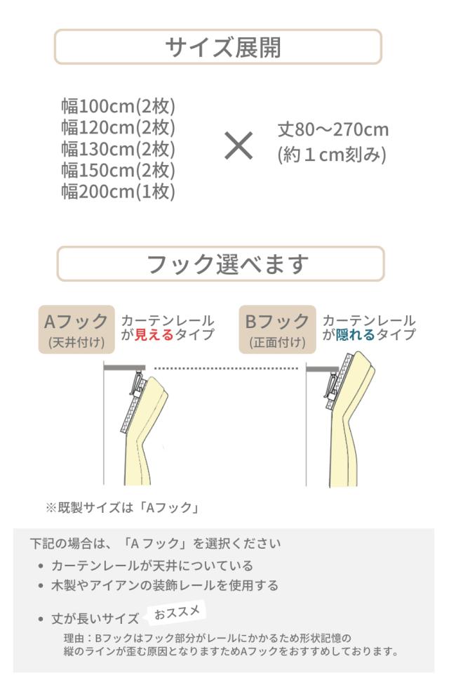 | ■ご注文の際は、カラー→サイズ幅→サイズ丈→フックの仕様を選択ください。 ※形状記憶加工がされている商品は、縦のラインが歪むことの原因になりますためAフックをおすすめしております(既成サイズはAフック) |