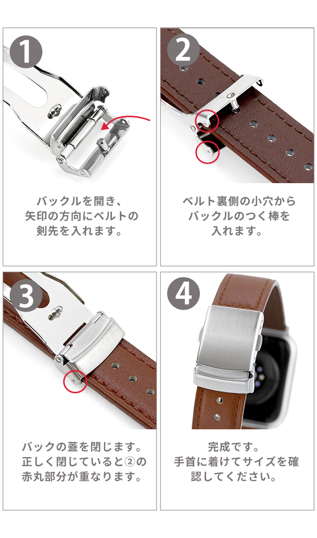 | 仕様 | ・撥水効果が高い、3M社製のスコッチガードレザーを使用。 ・レザーバックル(Dバックル)付きで、付け外しが簡単で、革へのダメージも軽減することができます。 ・本製品はApple純正品ではございません。 ・ベルトの留め具色はシルバーのみです。 |