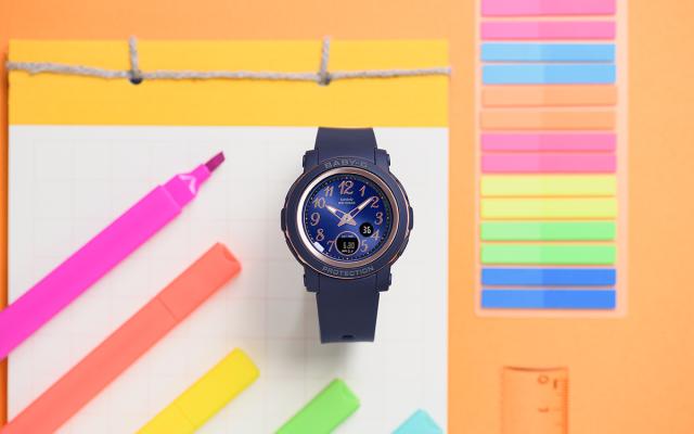 BGA-290はシンプルでスリムなデザインが特徴。カラーには上品で落ち着いた、ネイビーとピンクベージュをラインアップしました。時分針やインデックスのカラーは華やかな印象のピンクゴールドを採用。ベゼルリングには蒸着処理を施し、メタリック感が美しい質感に仕上げました。機能面では耐衝撃構造や10気圧防水搭載で実用性も兼備しています。