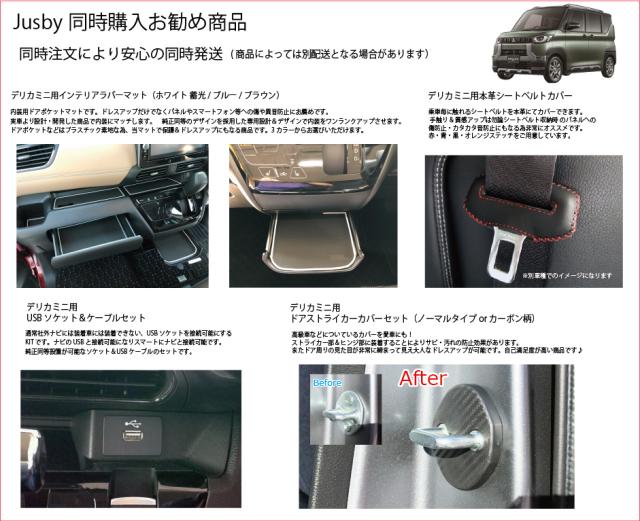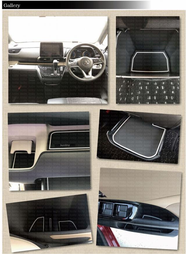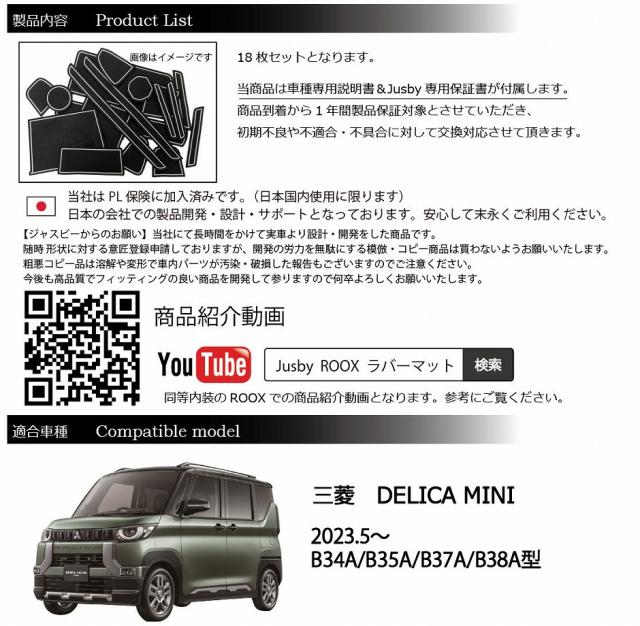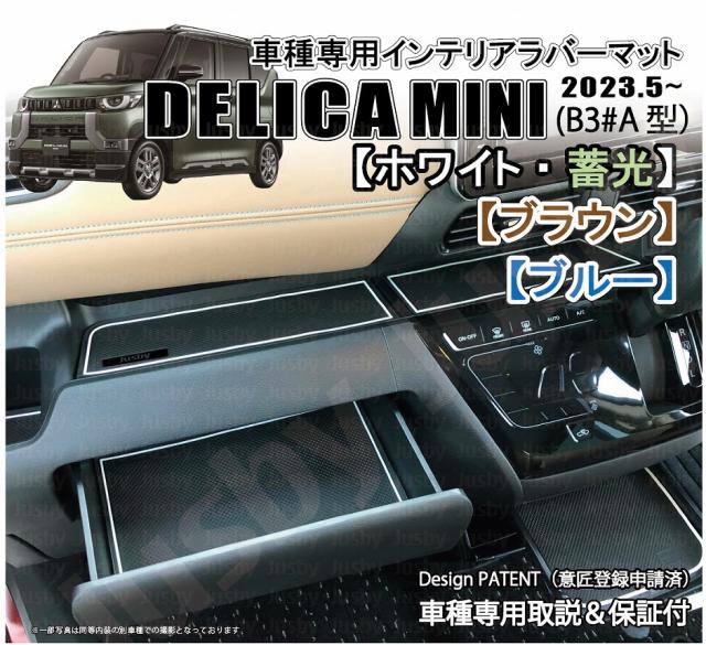 | 三菱 デリカミニ (DELICA MINI)専用ラバーマット(白色 or ブラウン or ブルー)になります。 2023.5月発売の三菱 デリカミニ専用インテリアラバーマットです。 スマートフォン等を置く場合等運転中のカタカタ音の防止やパネルへの傷防止、ドレスアップに最適です。 純正ドアポケット部等プラスチック部が露出している場所を当Jusby製マットで質感をアップできます。 全18枚セットで、デリカミニ に適合致します。車内が静かな事もあり小物が動いた際などパネルと干渉・異音等が発生しやすい為是非当マットで保護&ドレスアップをお勧めいたします。 3カラーのラインカラーから選択可能です。 白色ラインはどの内装とも調和しマッチします。またブルーラインはライトニングブルーマイカ等にマッチします。ブラウンラインは大人な質感をプラスしてドレスアップできます。 ◆ご注意◆ ・助手席前引出しポケットはティッシュBOXを入れて使用する場合はマットを装着した状態ですと高さが厳しい場合があります。 BOXタイプをご利用で干渉する場合はマットを外してご利用いただくか、箱タイプではなくビニールタイプのティッシュをご利用ください。 ・車種及び、お好みのカラーを選択してご注文をお願い致します。 (ご注意:ホワイトのみ蓄光です) 当商品には車種専用の取付説明書とJusby専用の製品保証書が必ず付属いたします。 またPL保険(製造物賠償責任保険)付きです。1年間は不具合・不適合・初期不良に対しての製品保証を行いますのでご安心してお買い求めください。 ( ・∀・)Φスタッフレビュー 専用設計なのでフィッティングがとにかく良く、純正の様に見えます。 携帯電話等車で充電しながらそのまま置いていた部分にもラバーマットで保護できる為、携帯電話及び車両パネルにも優し満足度が高い逸品です。ホコリやゴミが溜まりやすいポケット部も丸洗いできるゴムマットで清潔に保てます。 本当にお薦めです。 Jusby設計・開発のオリジナル商品です。デッドコピー防止の為、意匠登録申請済みです。(特許庁HPにてご確認ください)デッドコピーには「業者」及びコピー目的での購入者「個人」へ請求させていただきます。(Design PATENT by Jusby) |