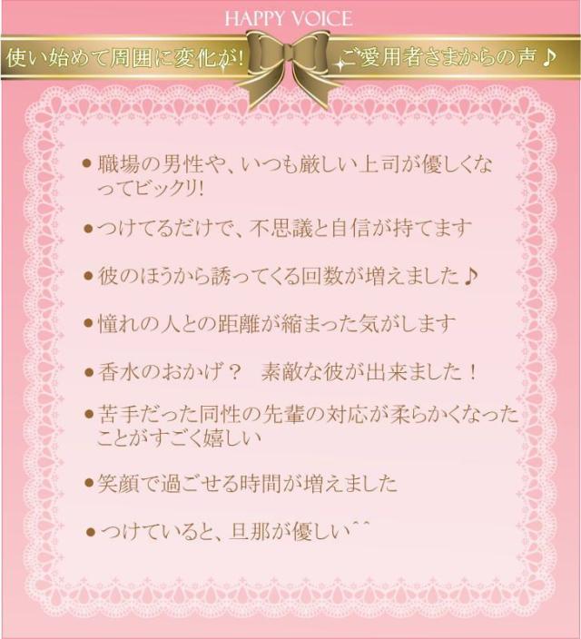 香りを気にせずいつでも気軽に使える!お気に入り香水との重ねづけももちろんOK♪何も変わらない毎日…なんてあきらめてしまう前に─。不思議なフェロモンパワーが凝縮された香りヴェールを身につけて、アナタの内に秘められた魅力オーラを解き放って!!!