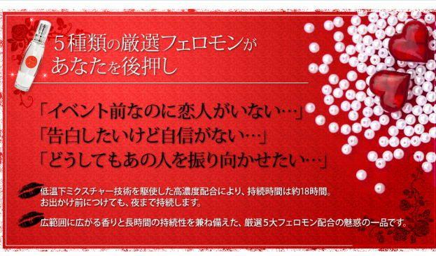 5大フェロモンがロマンチックな恋の始まりからセクシーで艶めく夜まで 華やかな香りと共に2人の時間を演出します。告白したいけど自信がない・・・。 どうしてもあの人を振り向かせたい・・・。そんなアタナ。イベントの大切な日を独りで過ごしたくない。。。 特別な日はより素敵な時間を過ごしたい…♪ そんなアナタも!
