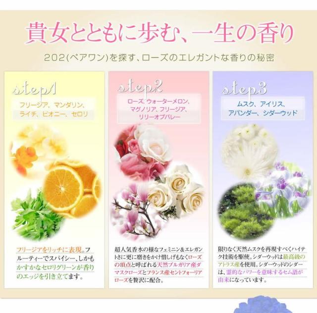 | 香料 | ローズ系のエレガントな香り STEP1 フリージア、マンダリン、ライチ、ピオニー、セロリ STEP2 ローズ、ウォーターメロン、マグノリア、フリージア、リリーオブバレー STEP3 ムスク、アイリス、アバンダー、シダーウッド |