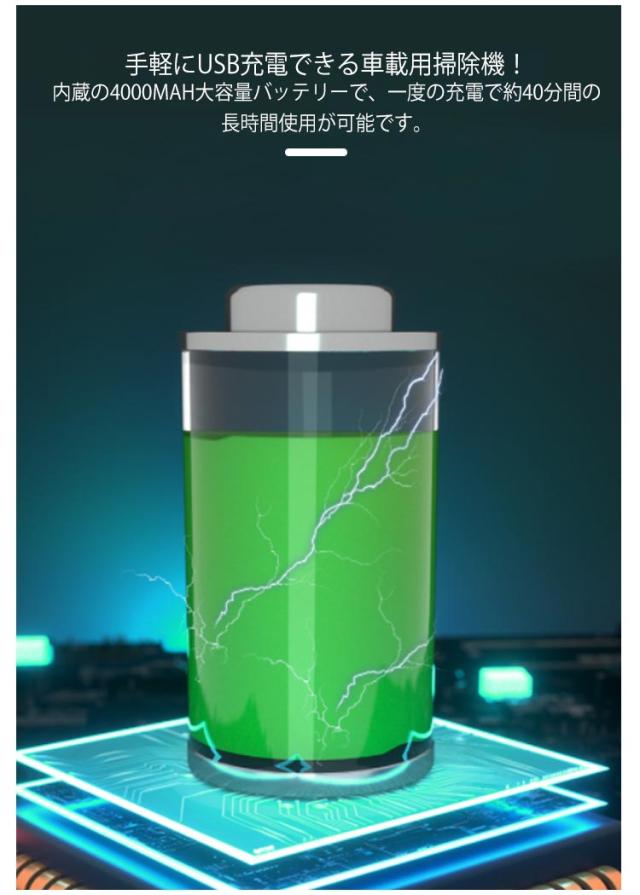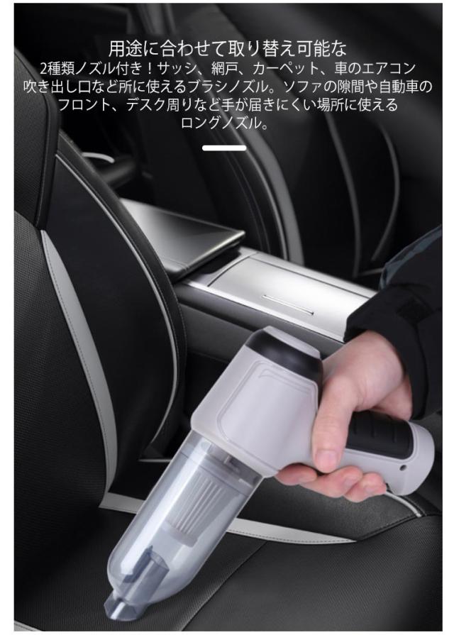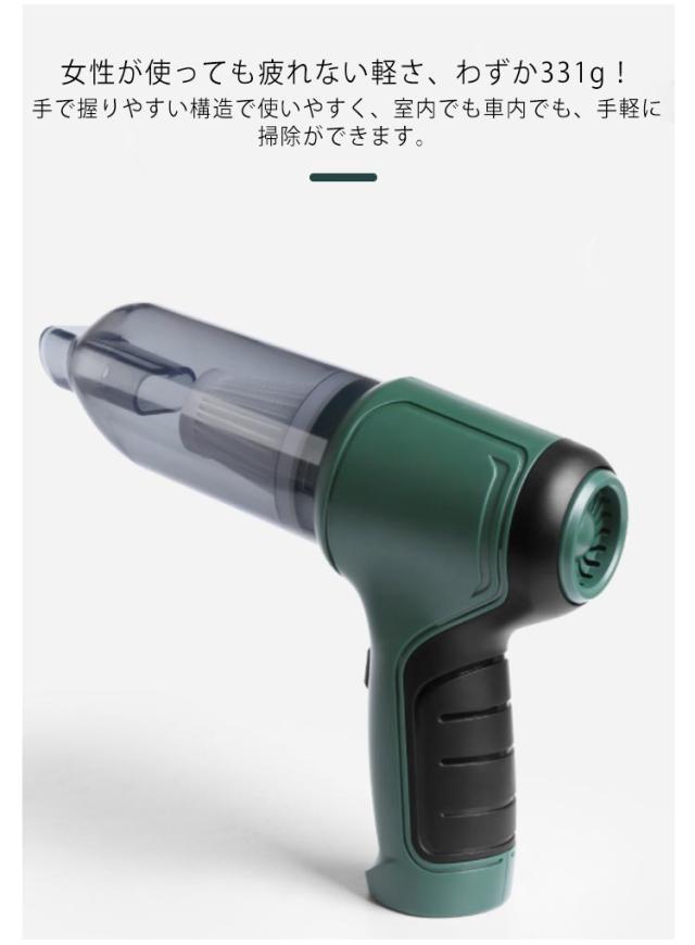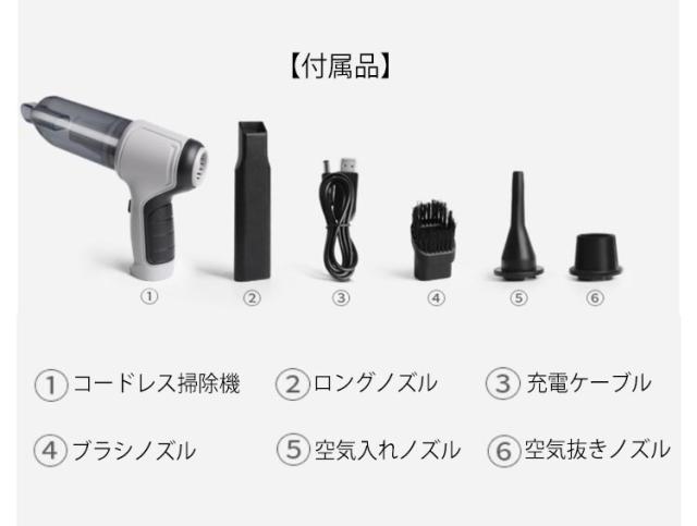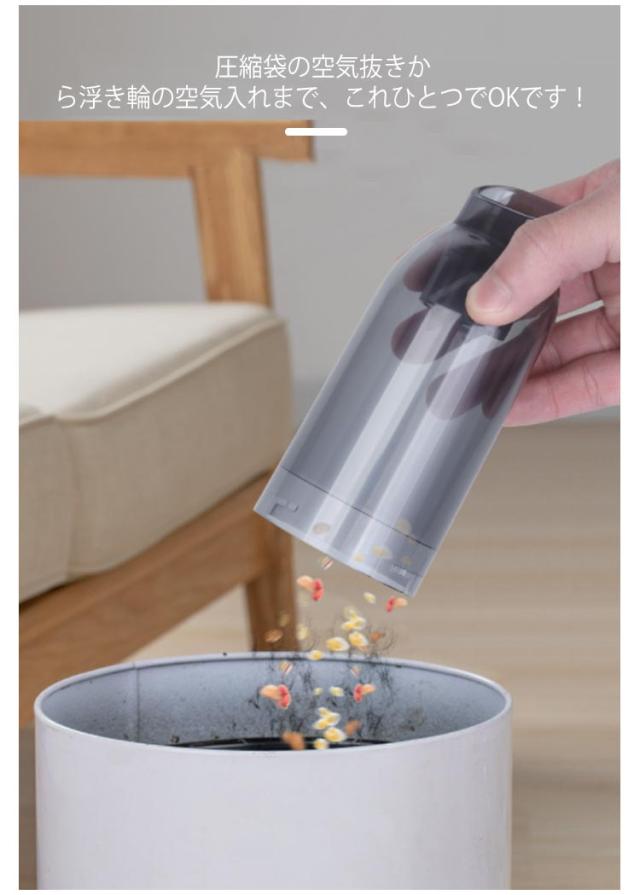 | 1台3役! 吸引力9000pa! 小型&軽量! 4000MAH大容量バッテリー!圧縮袋の空気抜き&浮き輪の空気入れもOK! 家の中や車内、オフィスのちょっとしたお掃除に最適なコードレスハンディクリーナー。 女性が使っても疲れない軽さ、わずか331g! 手で握りやすい構造で使いやすく、室内でも車内でも、手軽に掃除ができます。 パワフル吸引力9000pa!コードレスなのに強力吸引!細かいゴミでもガンガン吸い取る。 用途に合わせて取り替え可能な2種類ノズル付き!サッシ、網戸、カーペット、車のエアコン吹き出し口など所に使えるブラシノズル。ソファの隙間や自動車のフロント、デスク周りなど手が届きにくい場所に使えるロングノズル。 圧縮袋の空気抜きから浮き輪の空気入れまで、これひとつでOKです! 手軽にUSB充電できる車載用掃除機!内蔵の4000MAH大容量バッテリーで、一度の充電で約40分間の長時間使用が可能です。 お手入れ簡単!フィルター水洗い可能。 【付属品】 コードレス掃除機、ロングノズル、充電ケーブル、ブラシノズル、空気入れノズル、空気抜きノズル | |