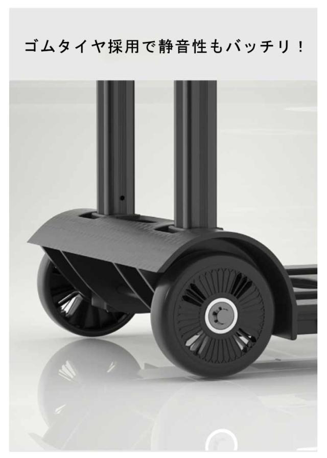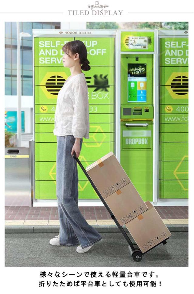 | 様々なシーンで使える軽量台車です。折りたためば平台車としても使用可能! いろいろ荷物をラクに運べる、様々なシーンで使える軽量台車★今まで重くて大変だった荷物の運搬がラクラクになります♪ ハンドルの高さは3段階に調整が可能!ハンドルのボタンを押して上に力をすこし加えると、ハンドルが長くなります。三段階の高さの設置には子供と大人等背が違っている人でも楽に使えます。 ゴムタイヤ採用で静音性もバッチリ! 使わないときは折りたたんでコンパクトに収納できます。畳んだサイズは小さいので、わざわざ保管場所を用意することがありません。女性でも楽に運べる程度の軽便な台車です。 事務運搬・家庭搬送・倉庫運び・ショッピング・旅行・レジャー・災害時などいろいろな場面で使えるので1つあれば非常に便利です。 | |