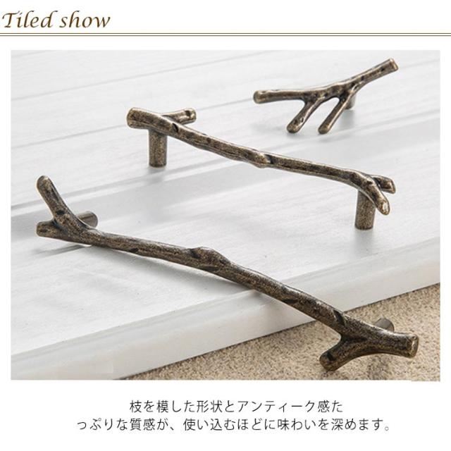 | 枝をモチーフにした引き出しハンドル。 枝を模した形状とアンティーク感たっぷりな質感が、使い込むほどに味わいを深めます。 アンティークやナチュラルのほか、北欧などのシンプルでウッディなインテリアにもおすすめ。 家具やインテリア小物を手軽にグレードアップできるアイテム。 | |