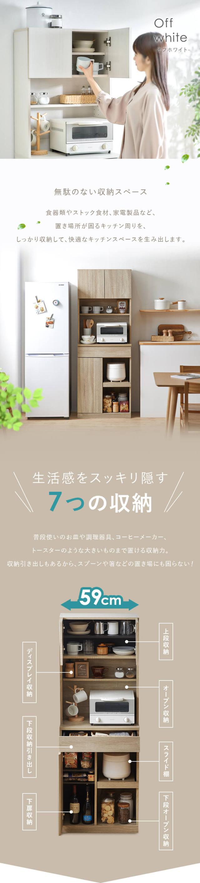 7つに分かれた収納スペースに、普段使う食器や調理器具・ストック食材をはじめ、コーヒーメーカーなどのキッチン家電まですっきり収まる収納力。