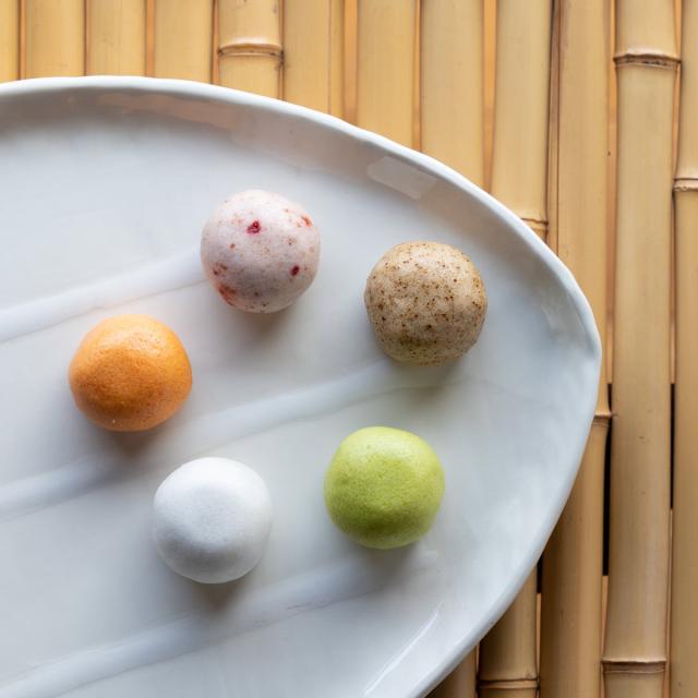 「五縁の味わいひとくち饅頭」は、松江の代表銘菓として親しまれる「朝汐」をベースに、地元産の素材を取り入れ、5種の風味と島根の風光明媚な景色を5色の彩りで表現しました。 【元祖朝汐】100年以上の伝統を誇る代表銘菓「朝汐」を一口サイズにしました。つくね芋の香り豊かな皮と、上品な皮むき餡(朝汐餡)の調和をお楽しみください。 【抹茶】松江の老舗茶舗の抹茶を餡に練りこみました。和菓子とお抹茶文化が息づく松江の風景を感じでいただける一品です。 【珈琲】松江市のスペシャルティコーヒー専門店が手がけるコーヒー豆「エチオピア」を合わせました。餡との相性バツグン。 【いちご】島根県安来産のいちごを皮と餡に用いました。甘酸っぱい味わいで、口いっぱいに幸せが広がります。 【獅子柚子】松江産の獅子柚子(ししゆず)を使用。爽やかな香りと優しい甘さが持ち味です。宍道湖の夕映えをイメージしました。