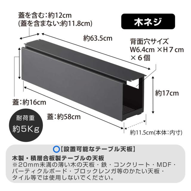 | サイズ | 外寸:約 幅63.5×奥行12×高さ17(cm) 内寸:約 幅57.8×奥行11.5×高さ16.8(cm) コード抜け穴:約幅6.4×高さ7(cm)(1つあたり) |