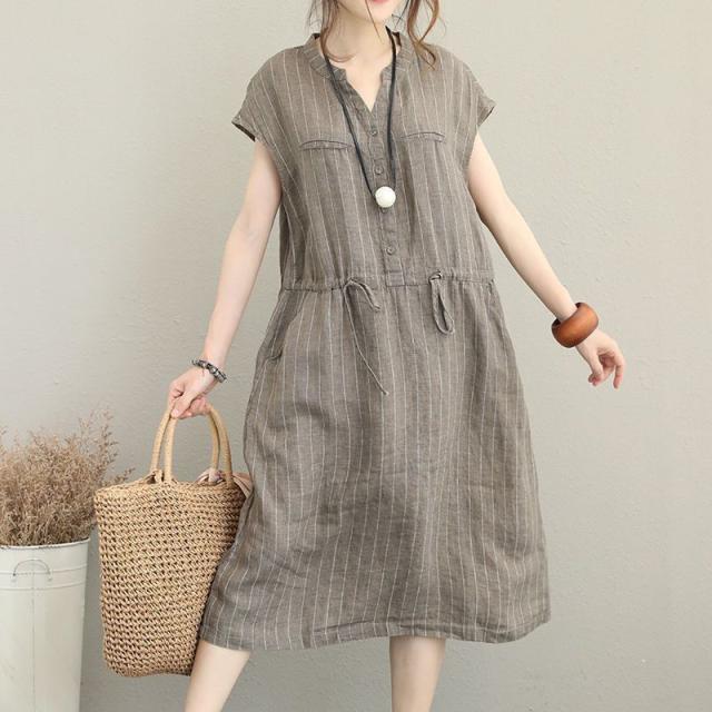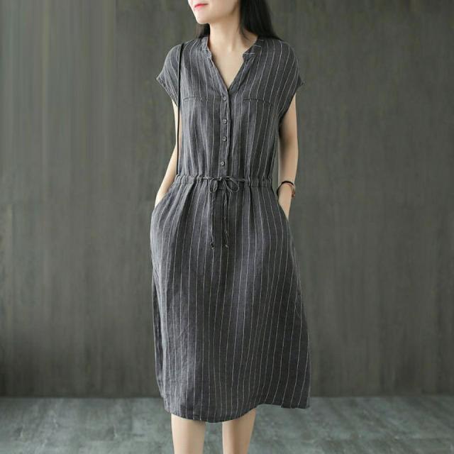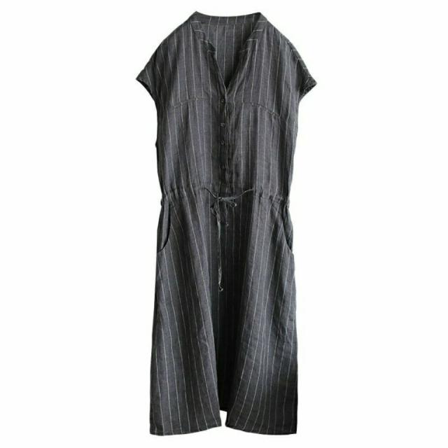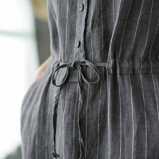 ワンピース 体型カバー 夏 リネン Vネック ロング きれいめ 着?せ シャツワンピース 縦縞 お洒落 レディー 大人 無地 マキシ丈