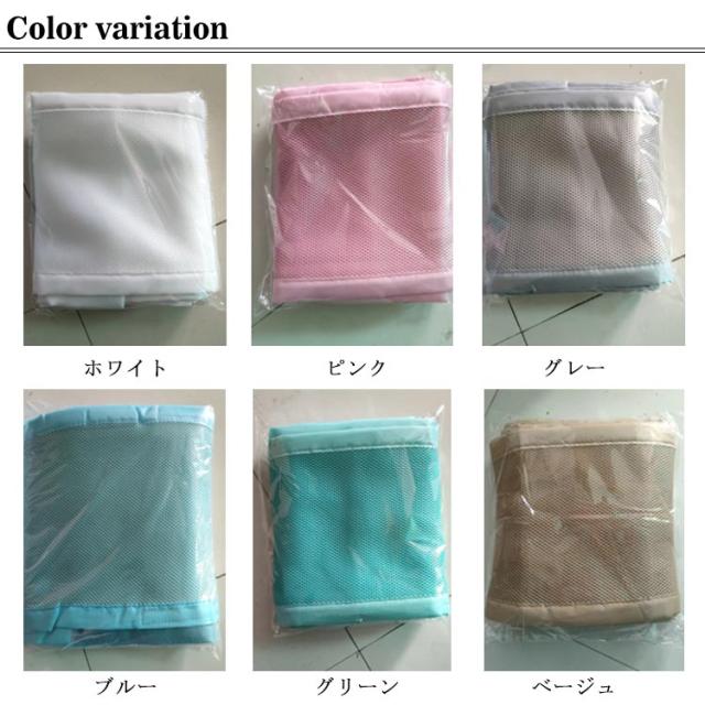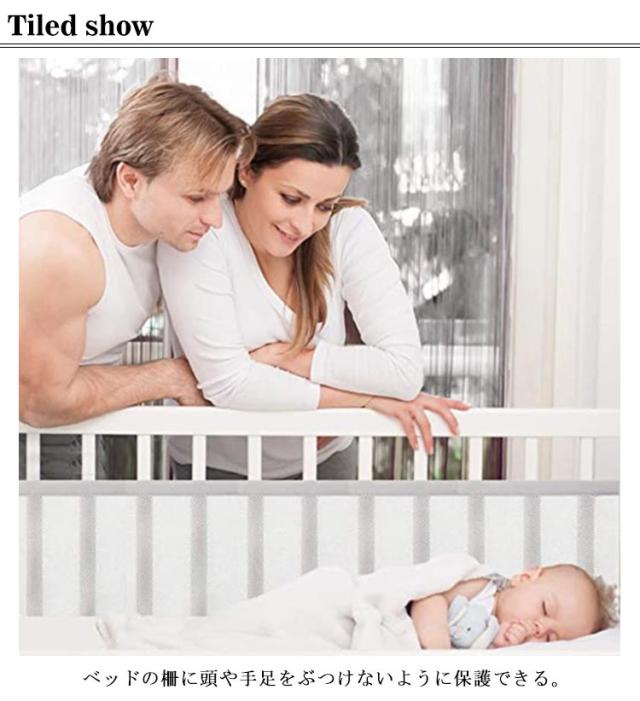 | 通気性抜群なメッシュ素材のベビーベッドガード。 通気性の良いメッシュを使用するので、ベビーベッドの中の空気を循環させて悪い空気がこもりません。 マジックテープで長さ調節ができるから、様々なベッドの形に対応しています。 紐でベッドに固定できるので、外れにくくより安全で安心です。 洗濯機で水洗いできるからお手入れ楽々。 ベッドの柵に頭や手足をぶつけないように保護できる。 柵の隙間を埋めて、手足を挟まないようにできる。 エアコンの風が直接当たらないように防ぐことができる。 上の子やペットのイタズラから守ることができる。 | |
