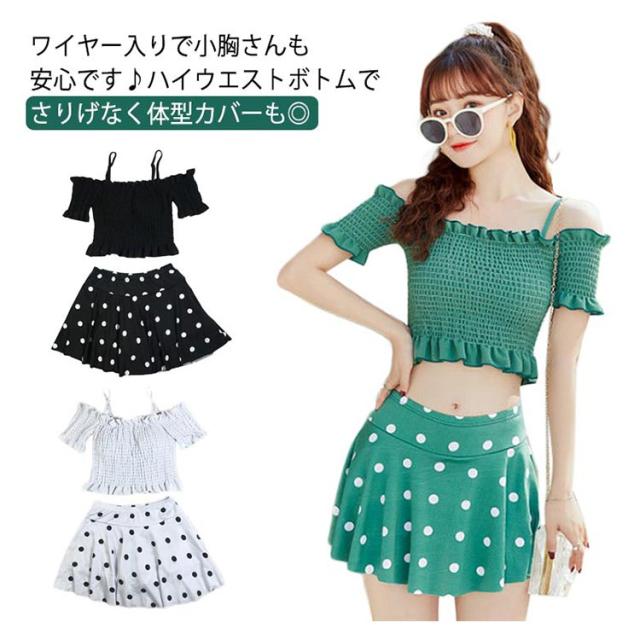 水着 体型カバー タンキニ ビキニ 2点セット 中学生 高校生 レディース 韓国 可愛い スイムウェア セパレート 水泳 女性用 ブラック フリル 水玉 海 プール 10代 20代 30代 オフショル 送料無料