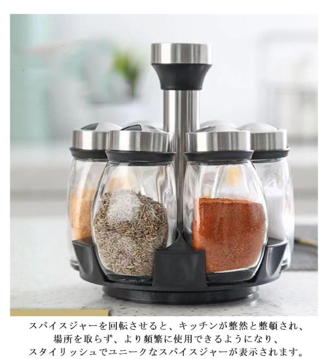 | 360°回転ブラケットには6つのガラス瓶があります。 一体化の調味料ラック。 各ボトルは、厚めガラス製です。丈夫で透明、見分けやすい調味料!使いやすい。 3種類の異なる大きさの孔型は多種の調味料に適用して、360°回転して、心のままに切り替えて、1本多役にたつ、使用しない時、回転して孔の位置がないまで(へ)できて、防塵密封して、健康衛生です。 スパイスジャーを回転させると、キッチンが整然と整頓され、場所を取らず、より頻繁に使用できるようになり、スタイリッシュでユニークなスパイスジャーが表示されます。 | |