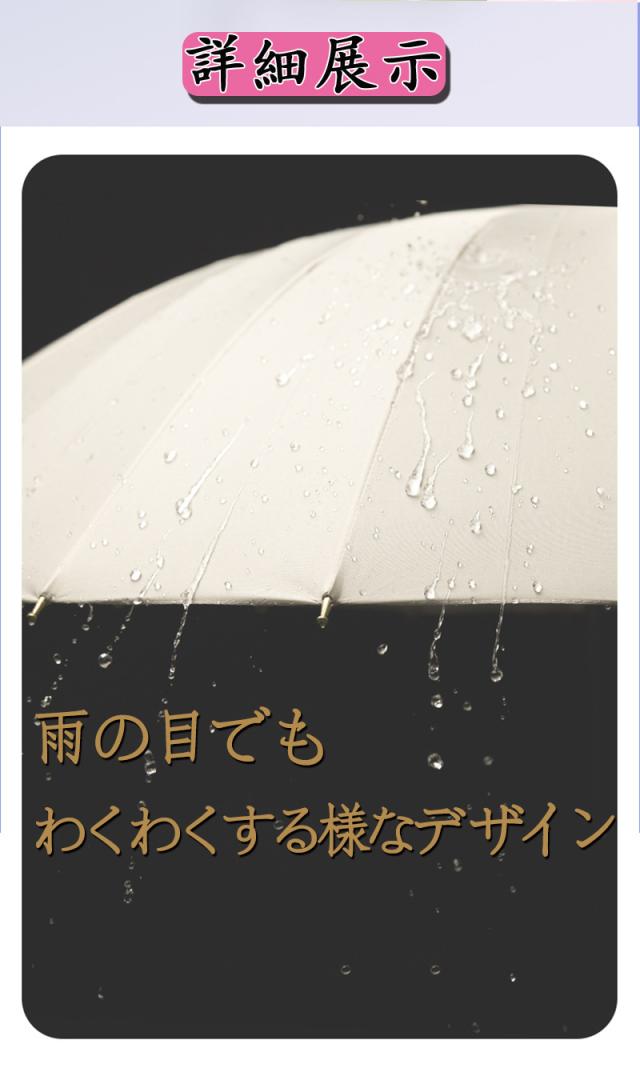 ★★★商品仕様★★★カラー:ネイビー/グリーン/ブルー/ブラック/ピンク/ベージュサイズ:116*64cm★★★商品説明★★★【おしゃれ・晴雨兼用傘 】ハイクォリティ傘のポイントであるグリップには高級感漂う。無地で、日本の伝統的なデザインを取り入れた和モダンスタイルは、洋服はもちろん、着物や浴衣などの和服にもぴったりです。【ワンタッチ自動開閉】片手でワンタッチで簡単に開け閉め折りたたみ傘です。雨の日や太陽強い日には乗り降りやカバンを持つ時は、一秒で傘を片手で開閉できます。出張、旅行へ携帯用など、車に置き傘として便利な一品です。【撥水・耐風】:生地は高級ポリエステルポンジ。防水撥水加工が施されているから、汚れにくく、撥水性にも優れています。骨が多いため、耐久性にも優れ、風にも強いです。デザインと機能を重ね備え、ビジネスにもデイリーにも活躍してくれる長傘です。【耐風性】フレームにグラスファイバー素材を採用し、しなやかさと強度がUPし、強風に吹かれても折れにくい構造となっております。
