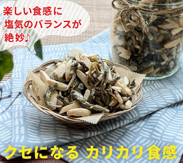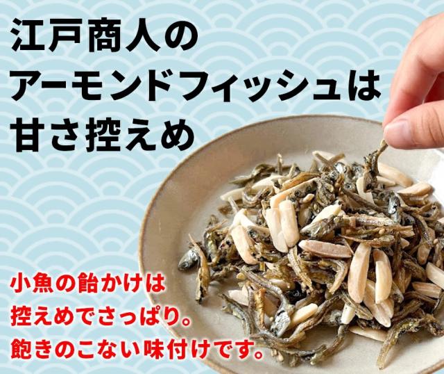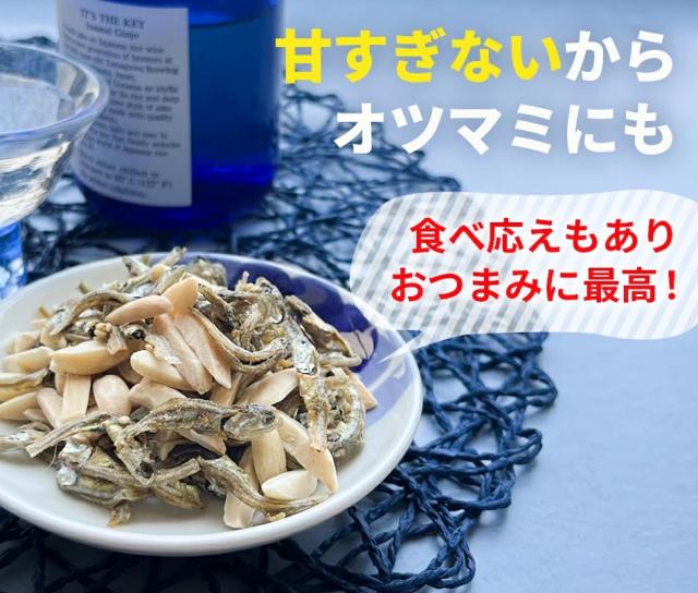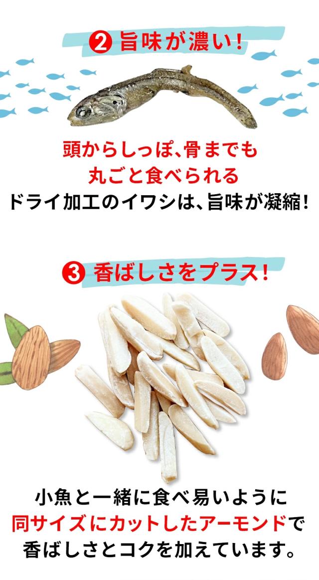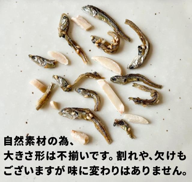 アーモンド(アメリカ産)、小魚〔煮干魚類(カタクチイワシ、食塩)、砂糖、ごま、唐辛子〕/調味料(アミノ酸等)、(一部にアーモンド・ごまを含む)