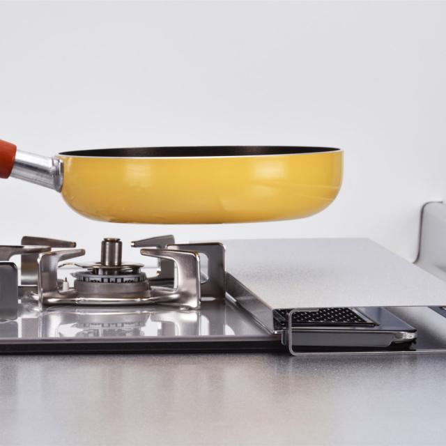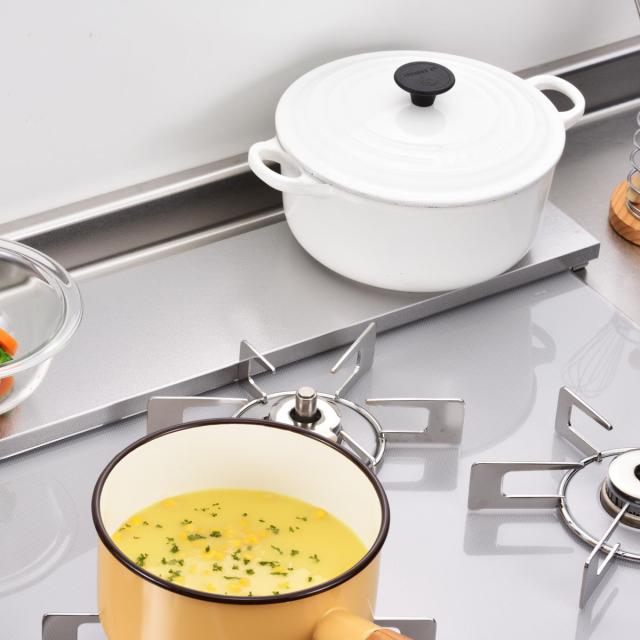 コンロの五徳よりも高さが低いので、調理中のお鍋やフライパンにあたりにくいです。一時置きする時などもスムーズに移すことができます。グリルをご使用の際に、壁に立てかけたり立てても邪魔になりません。対面キッチンなど、コンロの奥が広いキッチンであればそのままスライドするだけです。