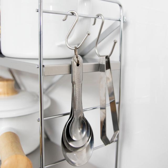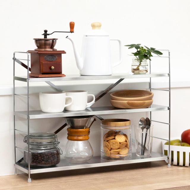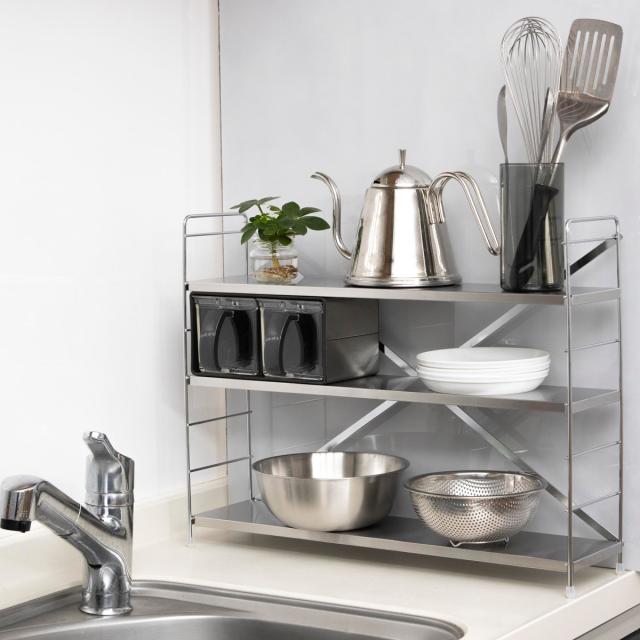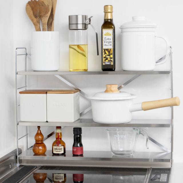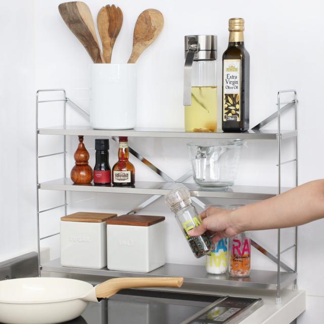 棚板はサビに強く丈夫なステンレス製。コンロ周りや水周りでも安心して長くお使いいただけます。シンプルでスタイリッシュなデザインは、ゴチャつきがちなキッチンをスッキリと見せてくれます。