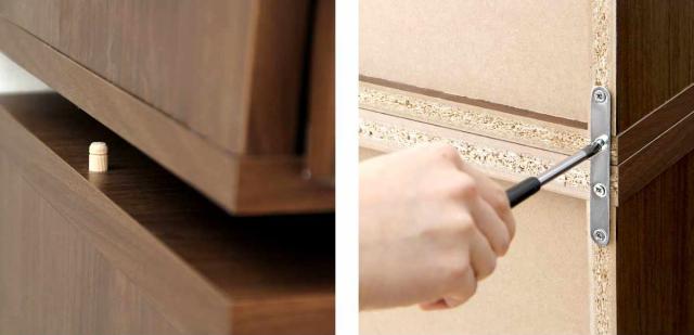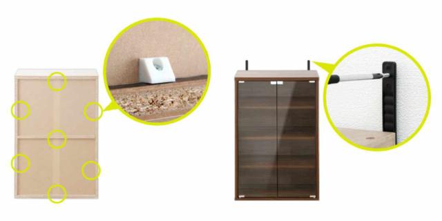 商品を重ねた際の安全性を考えて、左右を木ダボで連結することができます。また、連結用金具で上下をしっかりと固定するので横ズレを防止します。壁にネジ留めするタイプの転倒防止バンドも付属しているので、万が一の時も安心です。