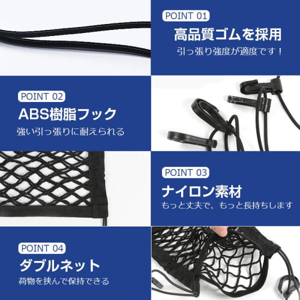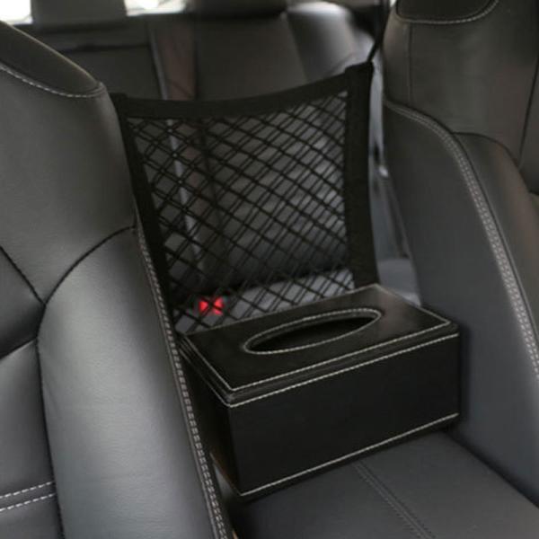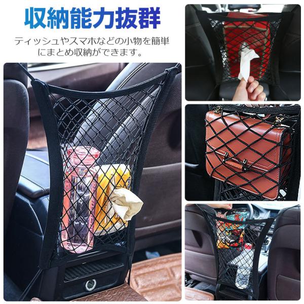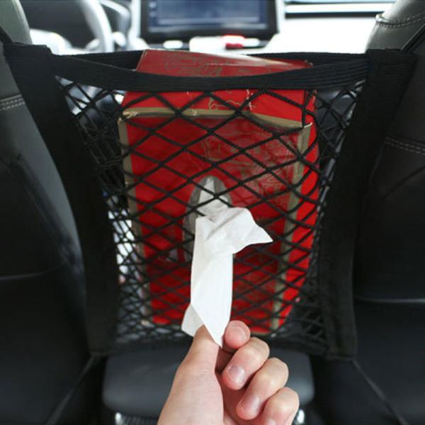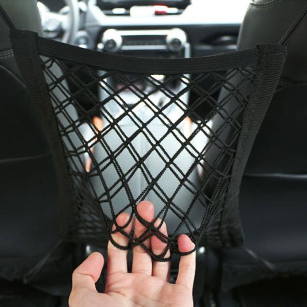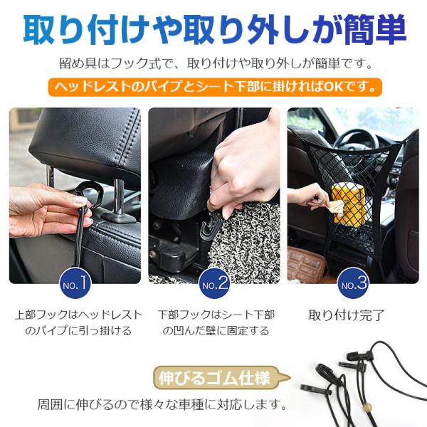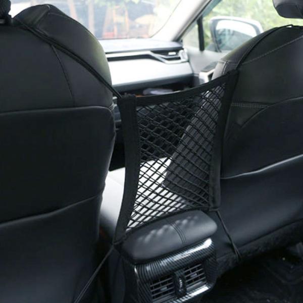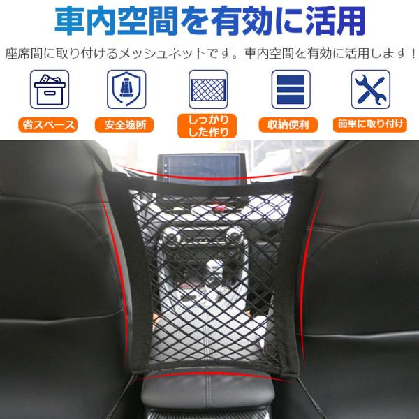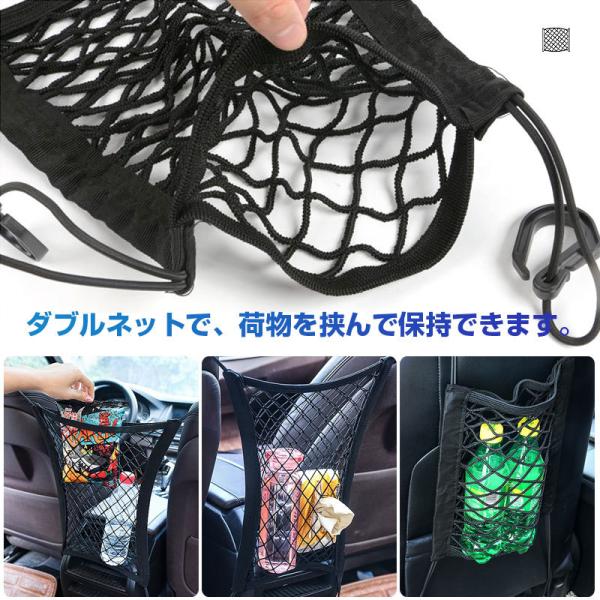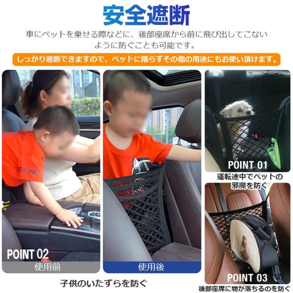 座席間に取り付けるメッシュネットです。車内空間を有効に活用する収納用グッズです。収納能力抜群、ティッシュやスマホなどの小物を簡単にまとめ収納ができます。その他、車にペットを乗せる際などに、後部座席から前に飛び出してこないように防ぐことも可能です。しっかり遮断できますので、ペットに限らずその他の用途にもお使い頂けます。ダブルネットで、荷物を挟んで保持できます。留め具はフック式で、取り付けや取り外しが簡単です。ヘッドレストのパイプとシート下部に掛ければOKです。周囲に伸びるので様々な車種に対応します。
