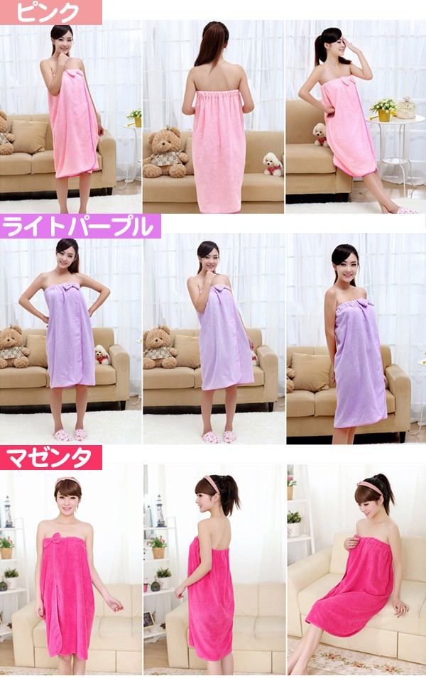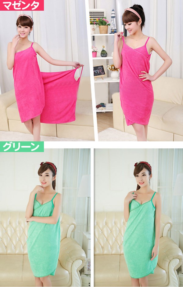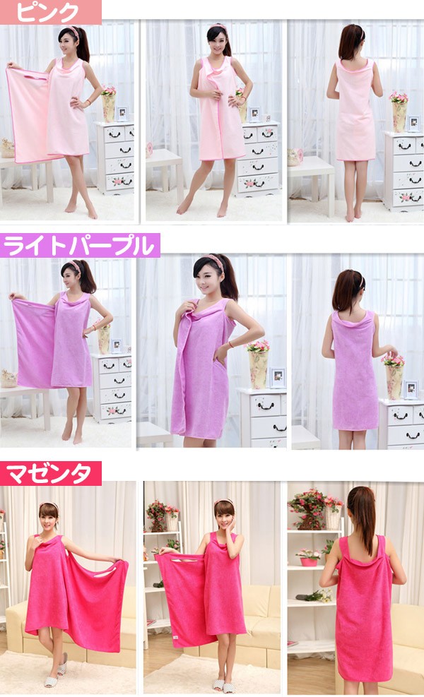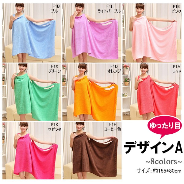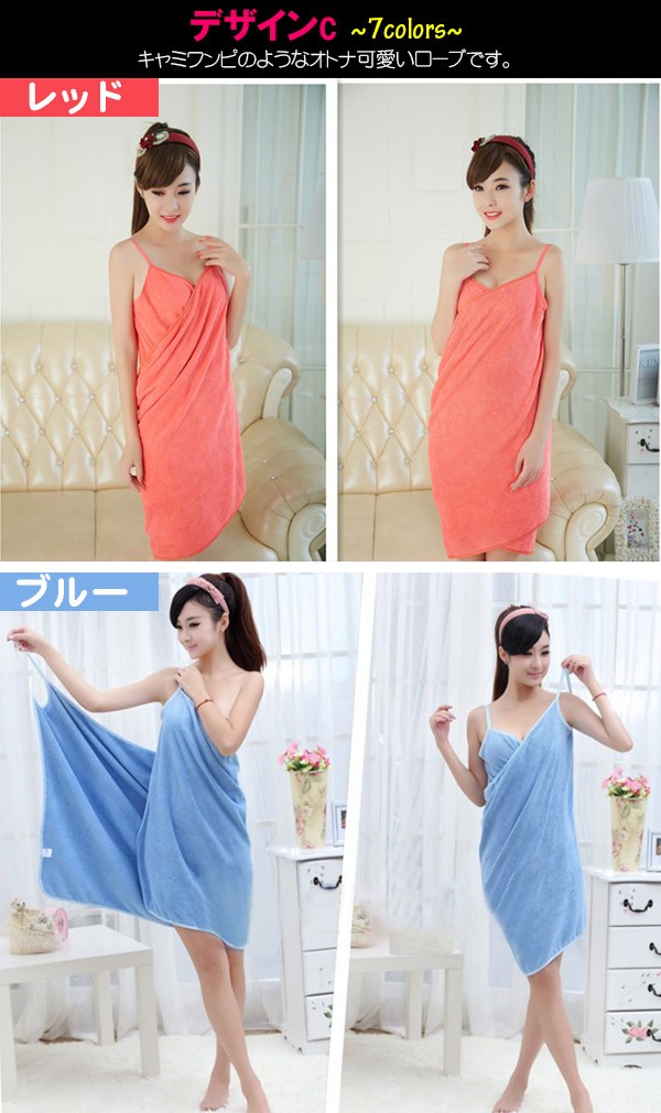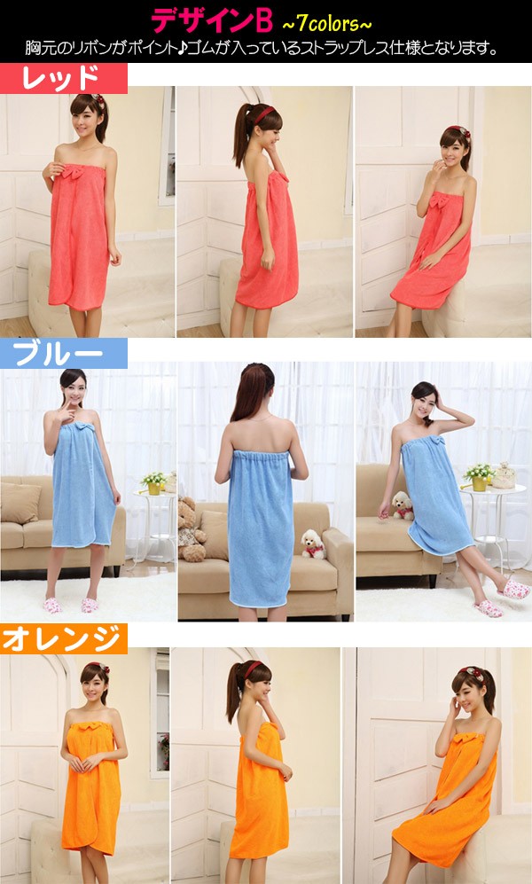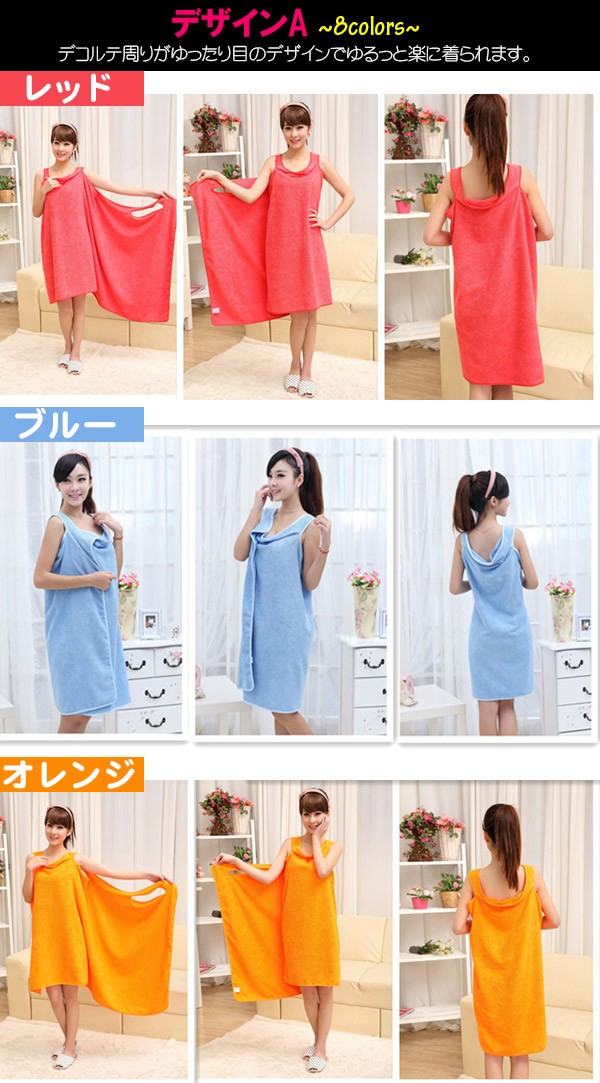 風呂上りやプールに便利なバスタオルが入荷! くるっと着られるワンピースのような3種類のオシャレデザイン!カラーも豊富!吸水力抜群!軽くてかさばらないのも便利です!ジムやスパで着替える前や、お化粧直しをしたい時にも便利です!ポリエステルとナイロンの素材には比較的乾きやすい特徴があります。丈約70〜80cmでひざ上くらいまでの大きめサイズで体スッポリ! デザインAはデコルテ周りがゆったり目のデザインでゆるっと楽に着られます。デザインBは胸元のリボンがポイント♪ゴムが入っているストラップレス仕様となります。デザインCはキャミワンピのようなオトナ可愛いローブです。