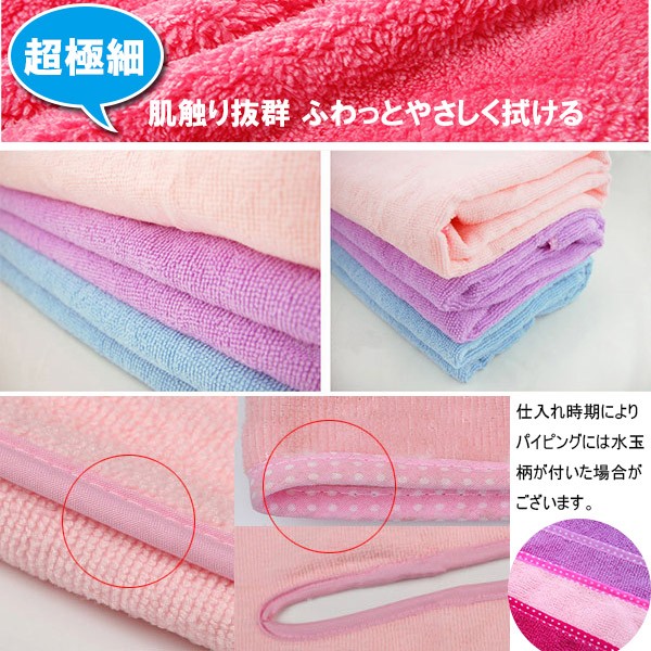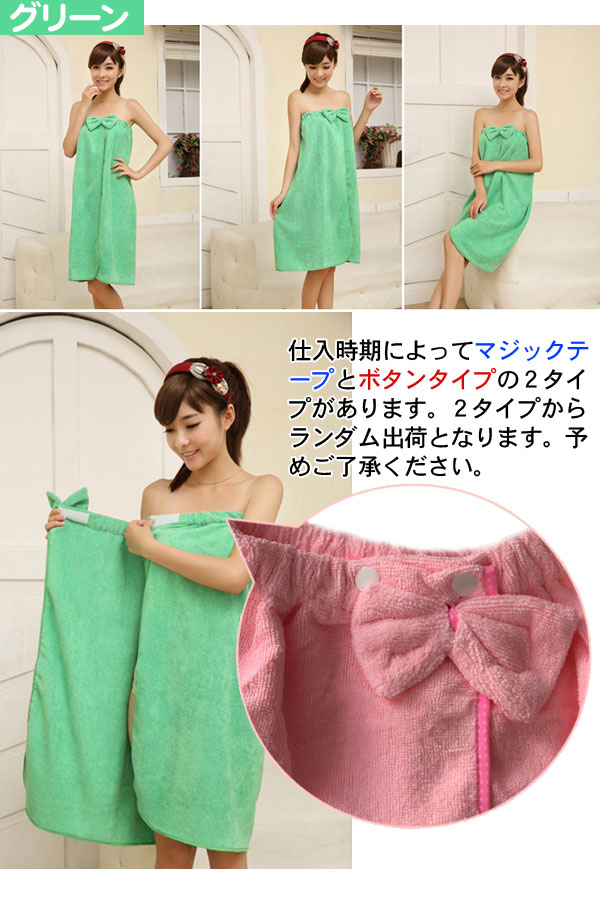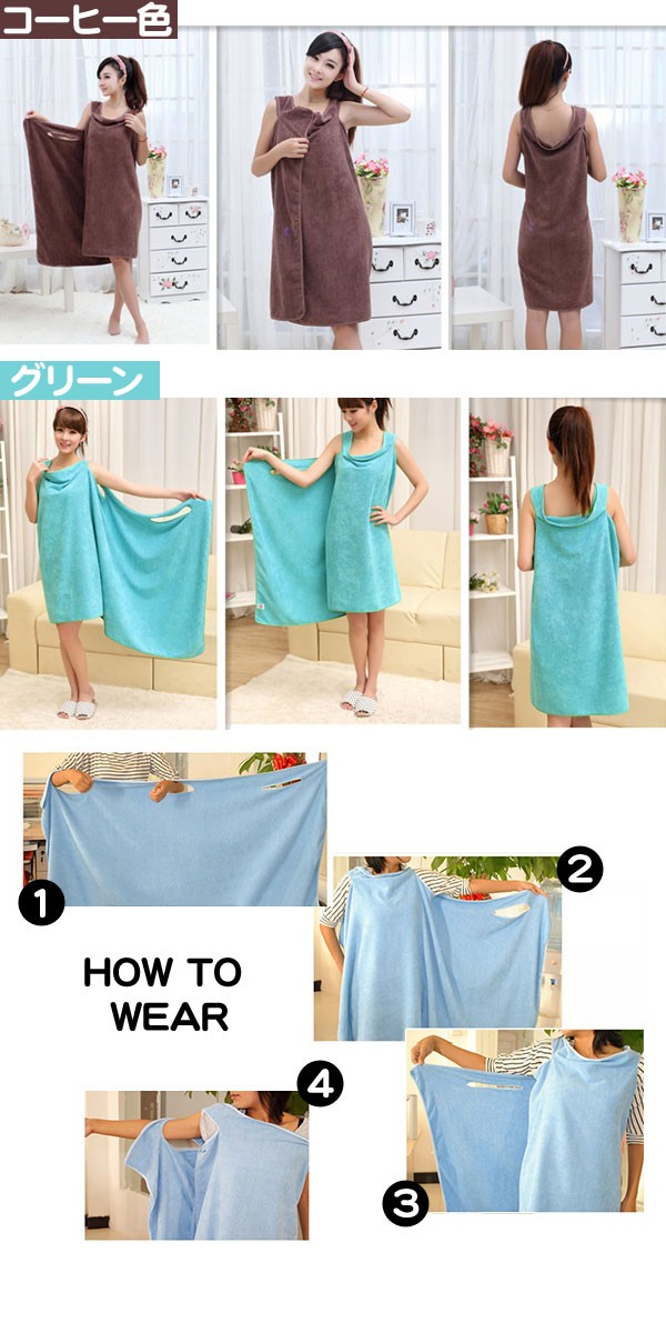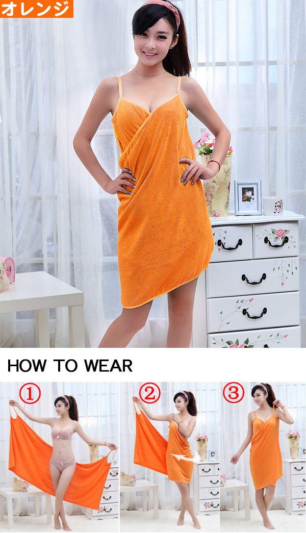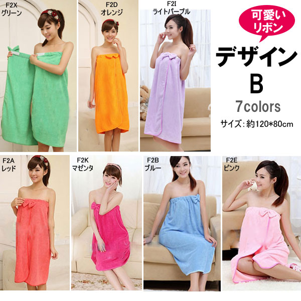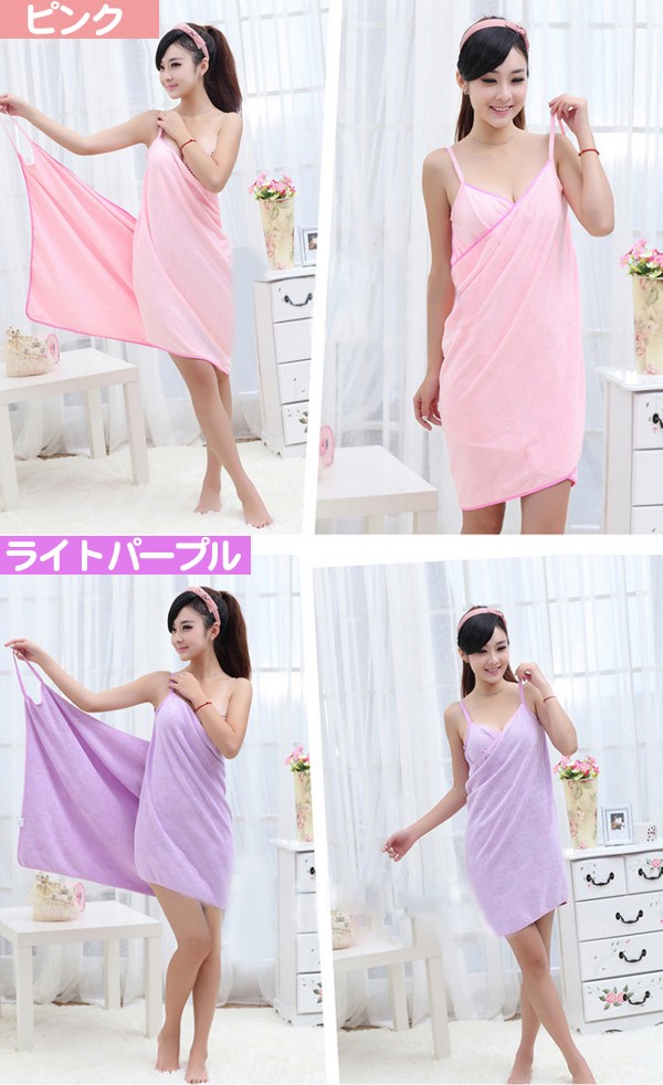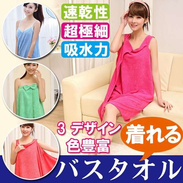 風呂上りやプールに便利なバスタオルが入荷! くるっと着られるワンピースのような3種類のオシャレデザイン!カラーも豊富!吸水力抜群!軽くてかさばらないのも便利です!ジムやスパで着替える前や、お化粧直しをしたい時にも便利です!ポリエステルとナイロンの素材には比較的乾きやすい特徴があります。丈約70〜80cmでひざ上くらいまでの大きめサイズで体スッポリ! デザインAはデコルテ周りがゆったり目のデザインでゆるっと楽に着られます。デザインBは胸元のリボンがポイント♪ゴムが入っているストラップレス仕様となります。デザインCはキャミワンピのようなオトナ可愛いローブです。