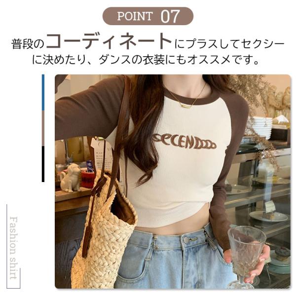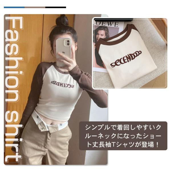 シンプルで着回しやすいクルーネックになったショート丈長袖Tシャツが登場!お洒落な配色が大人のこなれ感がさっと醸し出せる1着に仕上がりました。ストレッチ感のある柔らかい生地を採用し、優しく体にフィットするから着心地よく動きやすいです。タイトめなシルエットに細いリブで、細見え効果も◎上半身をすっきりとバランス良く見せ、着るだけでスッキリ綺麗に上品に決まります。首元から袖にかけて斜めに切替の入ったラグランスリーブがカジュアル感をプラス、動きやすさと落ち感を生みだしています。ショート丈でハイウェストボトムスと合わせて脚長効果よく、様々なコーディネートに活躍♪普段のコーディネートにプラスしてセクシーに決めたり、ダンスの衣装にもオススメです。インナーとして使えばオールシーズン使えるアイテムです。