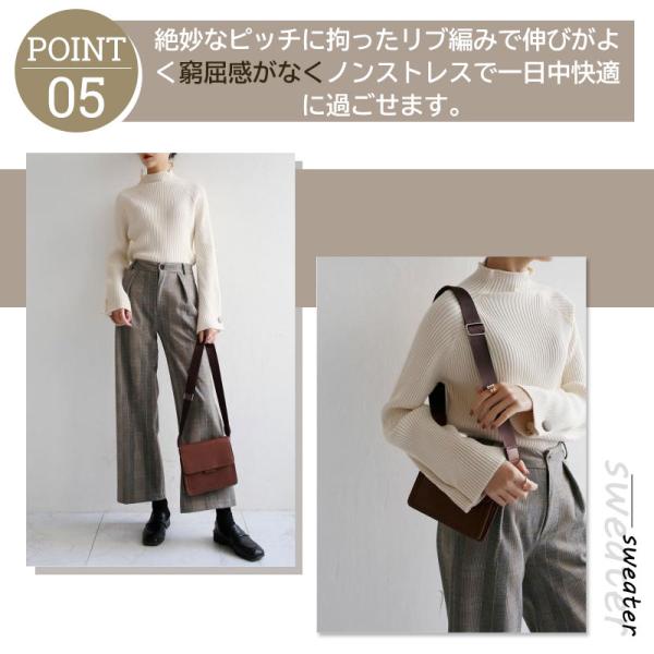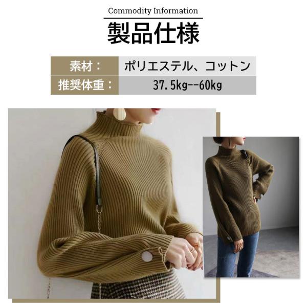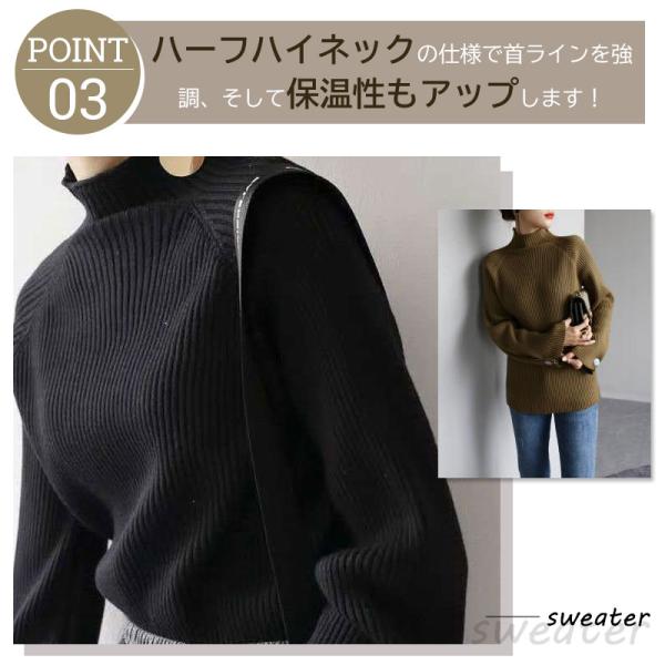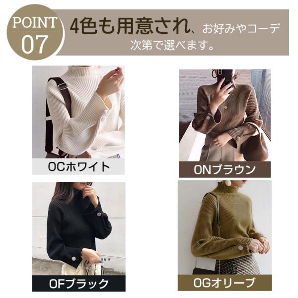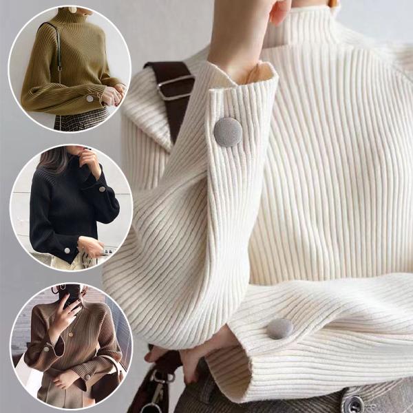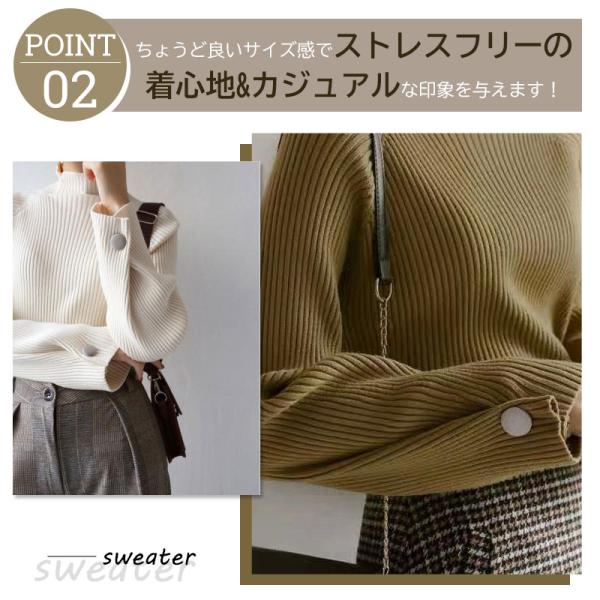 秋冬ファッションに欠かせない定番ニットセーターが登場しました!ちょうど良いサイズ感でストレスフリーの着心地&カジュアルな印象を与えます!ハーフハイネックの仕様で首ラインを強調、そして保温性もアップします!袖口の大きめワンボタンがアクセントになって手首をより華奢に引き立てて、更に女度増し!絶妙なピッチに拘ったリブ編みで伸びがよく窮屈感がなくノンストレスで一日中快適に過ごせます。合わせるボトムスを選ばず、今年らしいバギーデニムやスカートなどとも相性バッチリです!4色も用意され、お好みやコーデ次第で選べます。