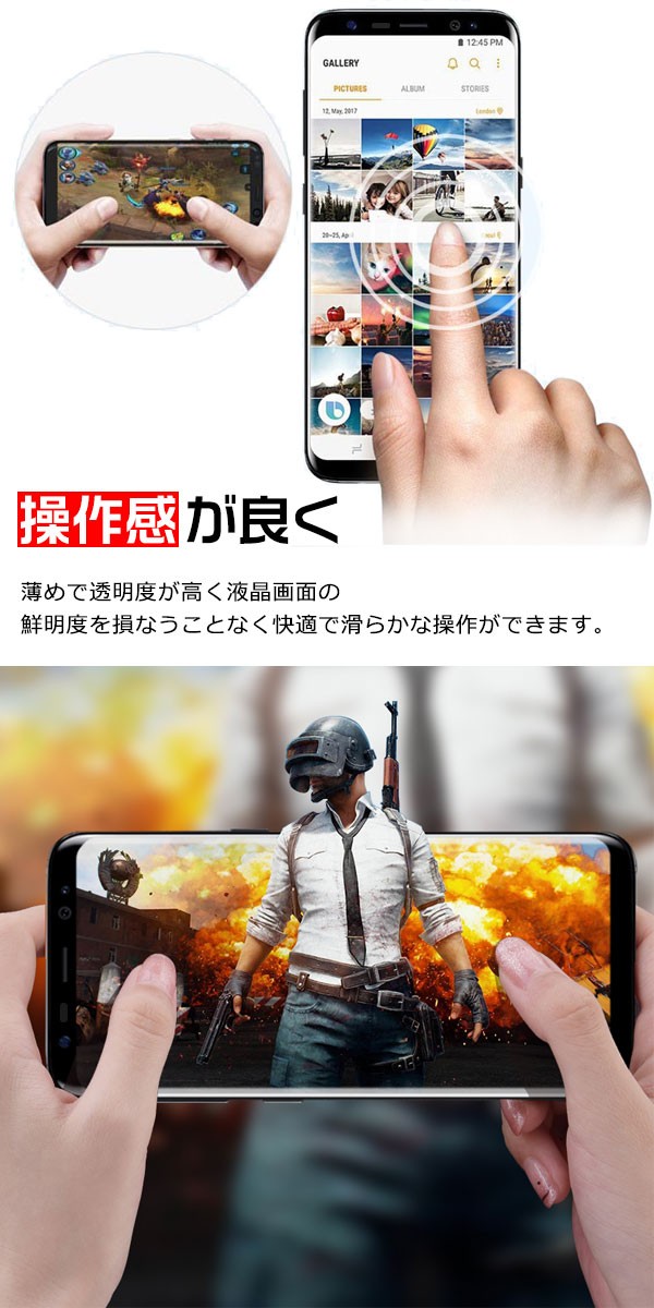 スマホのラウンドエッジに合わせた構造でスマホの曲面までしっかりガードします!高品質ガラスにラウンドエッジ加工がされているので、横からの衝撃を受けにくく、手触りの滑らかな仕上がりになっています!強化ガラス表面に指紋防止加工を施すことで指紋、ホコリ、化粧品等が付きにくく、綺麗に拭き取ることができます!割れてもガラスが飛び散らない特殊処理を行っているので、その破片で怪我をしたり、端末本体が故障するのを防ぎます。9Hの表面硬度を誇る保護フィルムが摩擦や傷から液晶をしっかりガードします。薄めで透明度が高く液晶画面の鮮明度を損なうことなく快適で滑らかな操作ができます。透過性の高いフィルムで画像の美しさが損なわれません。気泡防止加工したので、気泡が入らず誰でも簡単に貼り付けることができます。