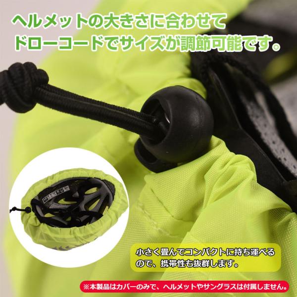 自転車用ヘルメットカバーです。ヘルメットへの装着が簡単!被せるだけですぐに使えります。!防水加工された生地で悪天候にも使えます!ヘルメットをすっぽり覆って、雨水の浸入をガードしますので、雨の日でも大切なヘルメットや頭部を濡らしません!夜の雨で見にくいときでも反射材があるので視認性はばっちりです。暗い所で車のライトなどに照射されると反射し、夜間やトンネル内での被視認性を高めます。ヘルメットの大きさに合わせてドローコードでサイズが調節可能です。小さく畳んでコンパクトに持ち運べるので、携帯性も抜群します。