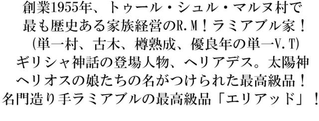 創業1955年、トゥール・シュル・マルヌ村で 最も歴史ある家族経営のR.M!ラミアブル家! (単一村、古木、樽熟成、優良年の単一V.T)ギリシャ神話の登場人物、ヘリアデス。太陽神へリオスの娘たちの名がつけられた最高級品!名門造り手ラミアブルの最高級品「エリアッド」!■さまざまなギフトアイテムをご用意しております。