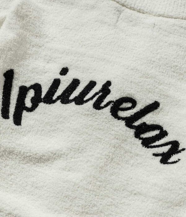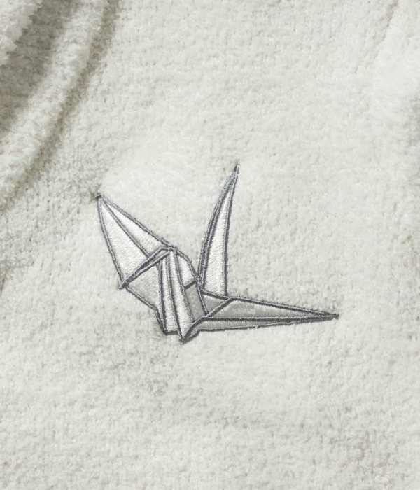 胸元に大きく折り鶴を刺繍しインパクトをプラス。バックには筆記体調のブランドロゴを配置し後ろ姿まで隙なく印象的に仕上げました。