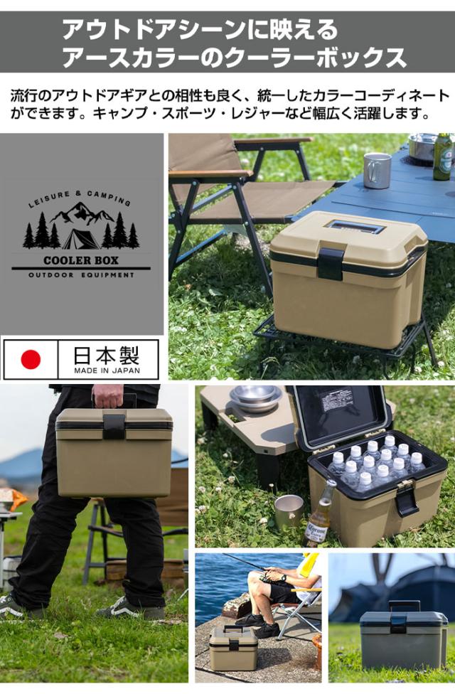 アウトドアシーンに映えるアースカラーのクーラーボックス。