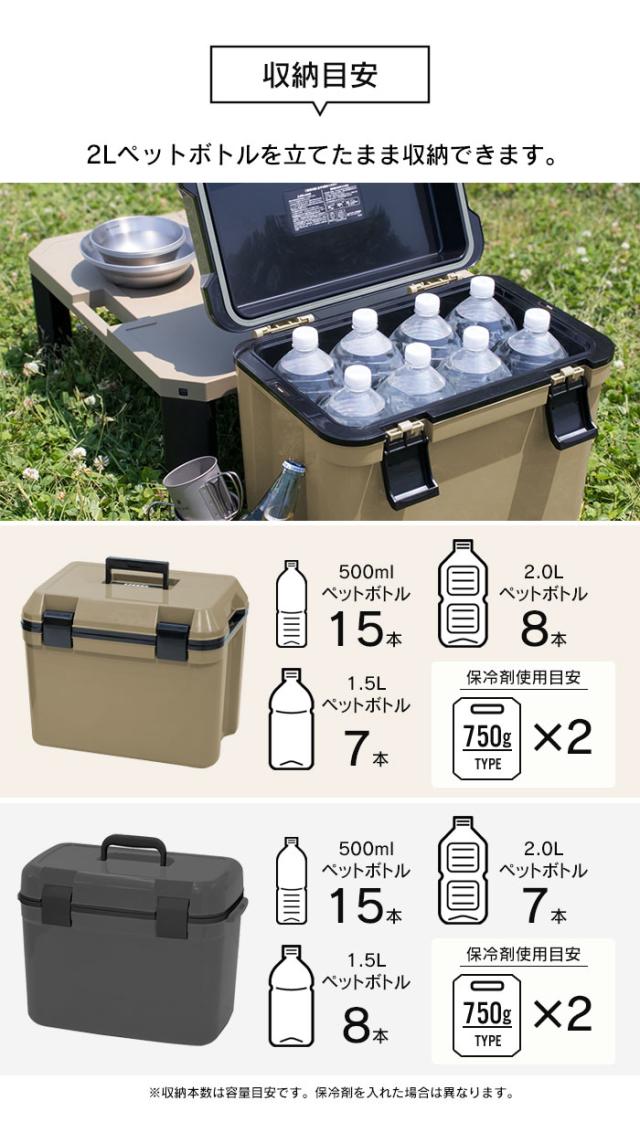 | [サンドベージュ] ・500mlペットボトル:15本 ・1.5Lペットボトル:7本 ・2.0Lペットボトル:8本 ・保冷剤使用量目安:750g×2個 [グレー] ・500mlペットボトル:15本 ・1.5Lペットボトル:8本 ・2.0Lペットボトル:7本 ・保冷剤使用量目安:750g×2個 (※収納本数は目安です。保冷剤を入れた場合は異なります。) |