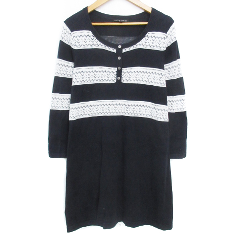 【中古】ローラアシュレイ ニットワンピース ミニ丈 長袖 ヘンリーネック 切替 ボーダー柄 M 白 黒 /FF14 レディース
