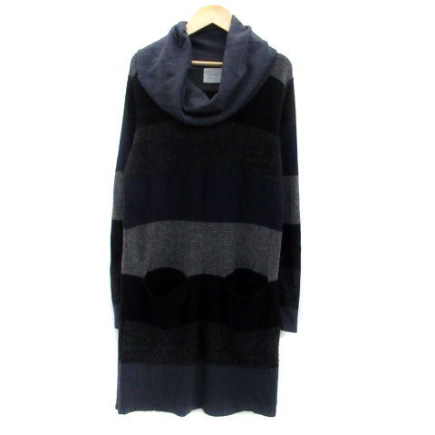 【中古】レッドシーム ニットワンピース オフタートルネック 長袖 ミニ丈 ボーダー柄 ウール混 38 紺 黒 レディース