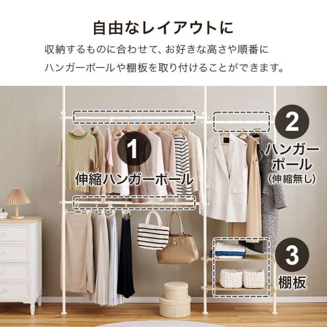 幅やポールの高さが変えられる自由に伸縮可能な突っ張り伸縮ハンガーラック。