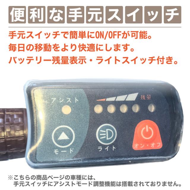 ※この車種は乗車重量が65kgで設計されておりますので、著しく重量がオーバーした状態で乗用された場合、各部の消耗度合、劣化度合が大きくなります(アシスト走行距離も短くなります)。