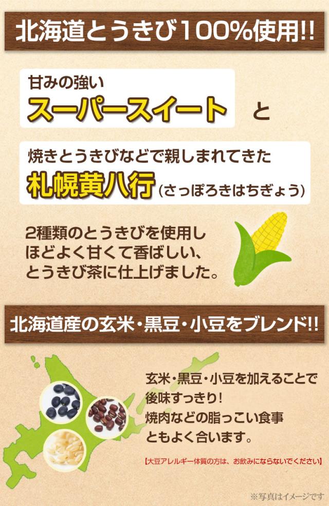 うきびのおいしさが詰まった、甘く香ばしいとうきび茶です。北海道産のとうきび、玄米、黒豆、小豆を100%使用したノンカフェインの無糖ブレンド茶なので、妊娠中の方やお子様も安心してお飲み頂けます。
