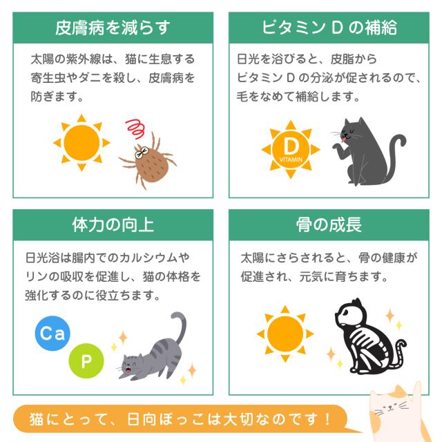 猫にとっての日光浴は、菌やダニなどの寄生虫を抑えたりなど、様々な効果がある大切な行為です。