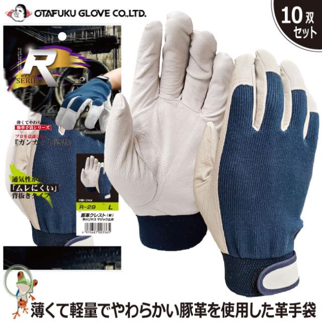 手袋 革手袋 おたふく R-29 豚革クレスト甲メリヤスマジック 紺 特価10双セット 作業手袋 豚皮手袋 革手袋 手首マジック フィット 柔らかい 薄くて軽量 背抜き手袋