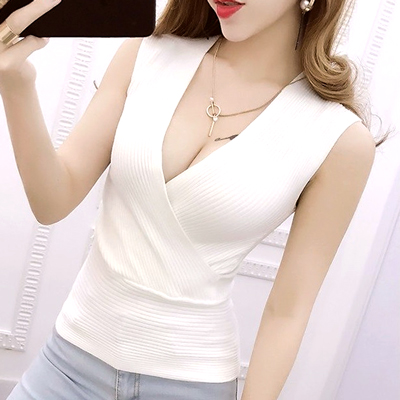 送料無料 胸元セクシー ノースリーブ ニット Vネット ホワイト トップス