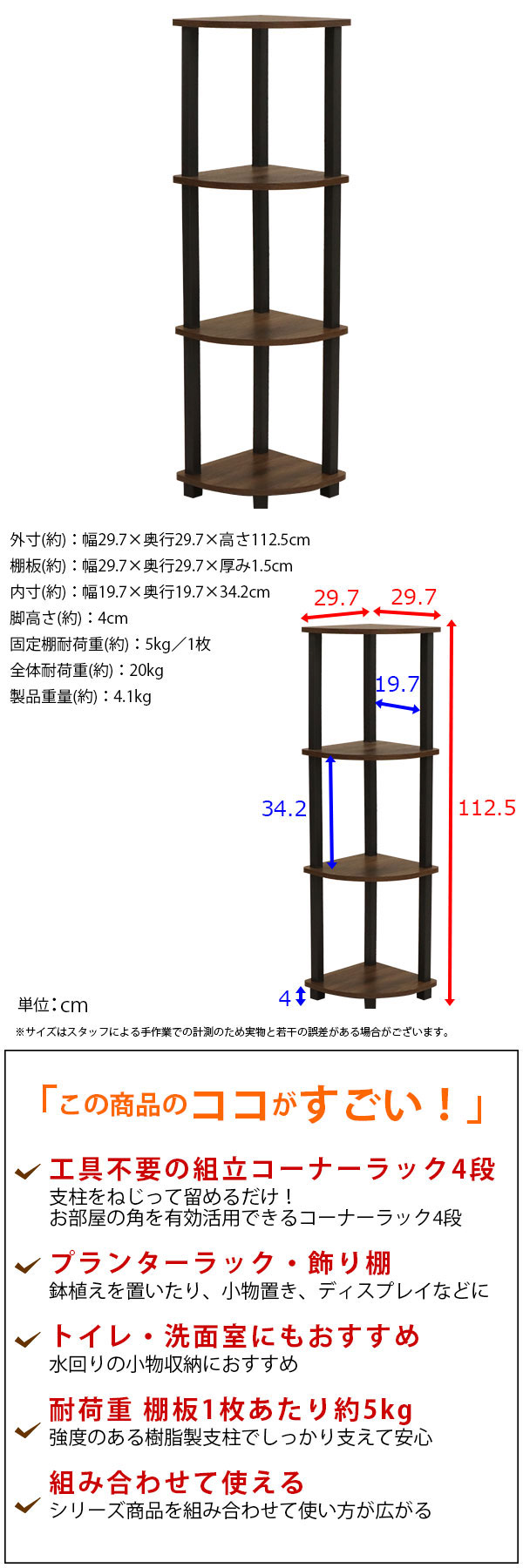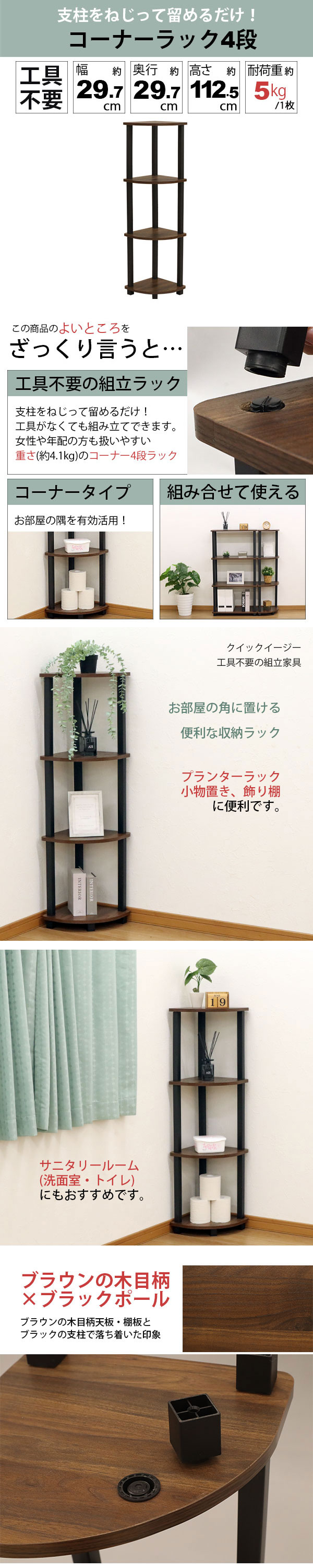 収納ラック コーナーラック 4段 工具不要 簡単組立 4段ラック 4段コーナー用収納 幅30cm(29.7cm) 奥行30cm(29.7cm) 高さ112.5cm おしゃれ コーナー 棚 サニタリーラック 隙間 トイレ収納 ランドリー 洗面所 脱衣所 玄関 電話台 A4対応 飾り棚 シンプル 軽い 軽量 ブラウン