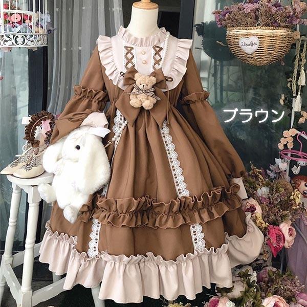 ロリータ ビッグカラー ワンピースとヘッドドレス2点セット クラロリ ゴスロリ 長袖あり 袖付き Aライン Lolita リボン フリル裾 クリスマス レディース コスチューム 衣装 かわいい 仮装 パーティ お茶会 学園祭 文化祭 デート イベント
